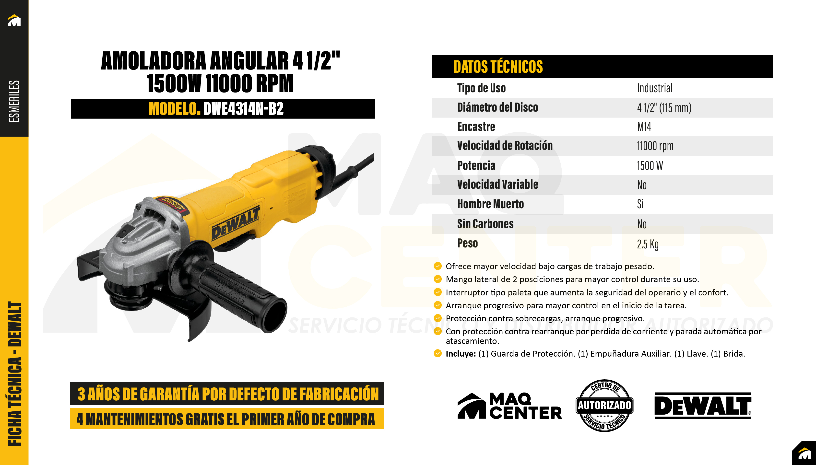 Esmeril angular de 5.0", potente motor de 1.500W. Ofrece mayor velocidad bajo cargas de trabajo pesado, circunferencia de agarre pequeña. Sistema de extracción de polvo mayor, interruptor tipo paleta, empuñadura lateral anti-vibración, ofrece al usuario comodidad y seguridad en el uso, guarda de ajuste convertible, ofrece al usuario la opción de convertir la guarda con uno o dos movimientos para ajustar. Protección contra sobrecargas, arranque progresivo, protección contra rearranque por perdida de corriente, parada automática por atascamiento.