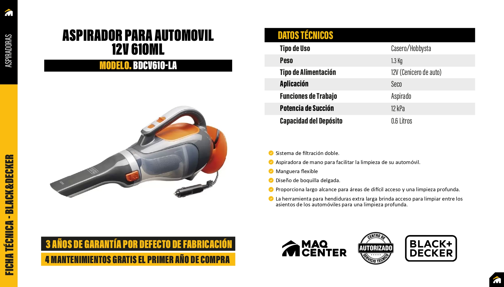 Aspiradora 12v para carro 610ml - bdcv610-la