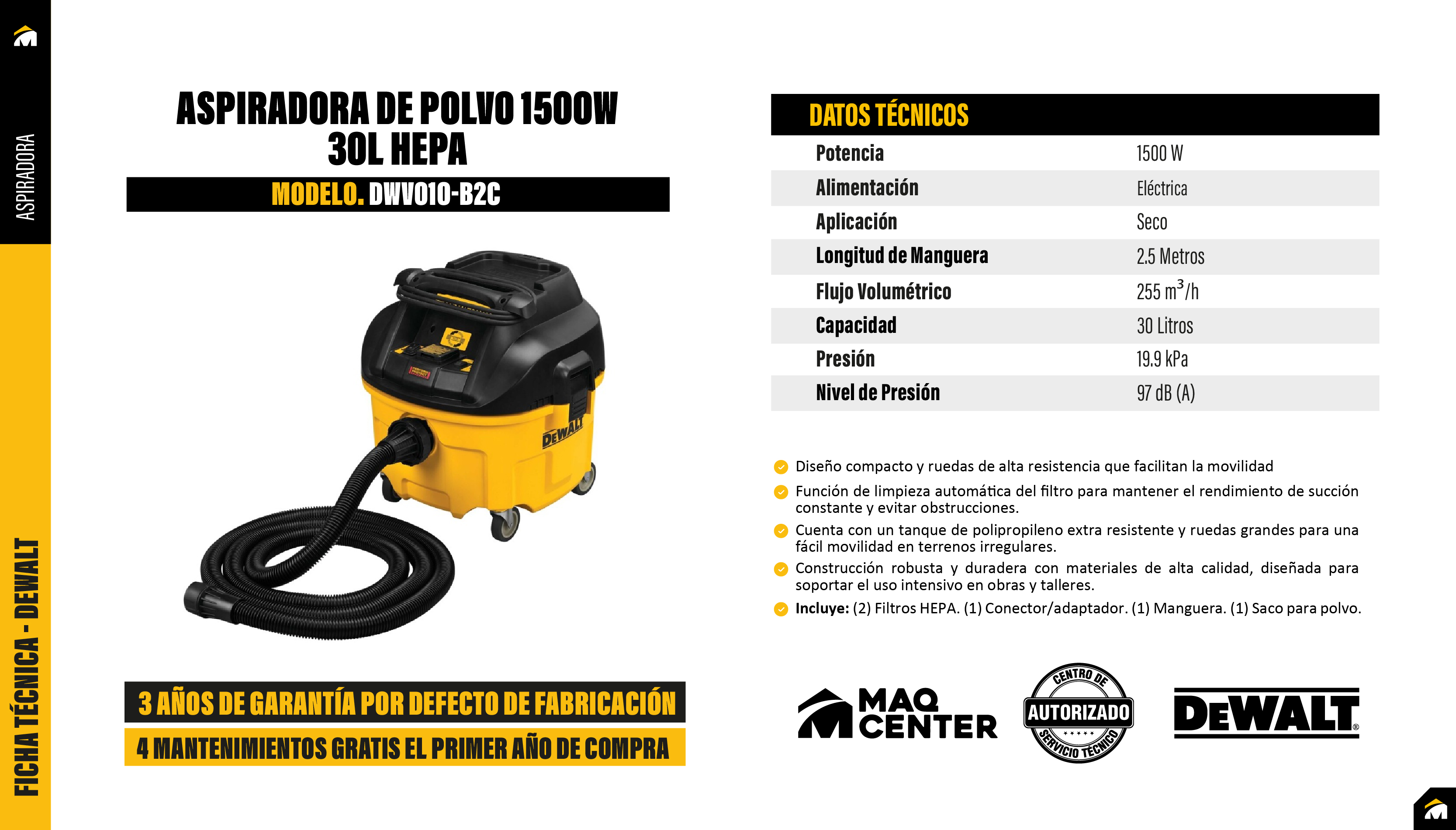 Además de su potente rendimiento, la DWV010 cuenta con un diseño robusto, compacto y fácil de transportar gracias a sus ruedas resistentes y asa superior. Su sistema de arranque automático al conectar herramientas eléctricas la hace ideal para trabajar en conjunto con sierras, lijadoras u otras máquinas, recolectando el polvo al instante para mantener el área libre de residuos. Es una solución completa para profesionales que buscan potencia, eficiencia y durabilidad en un solo equipo.
