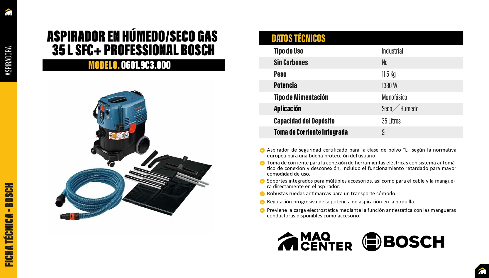 Incluye: (1) Filtro de plisado plano de celulosa (2607432033). (1) Boquilla para hendiduras (2607000165). (1) Bolsa de eliminación (2607432043). (1) Codo (2608000573). (1) Conjunto de boquilla de piso (1609390478). (1) Módulo SFC +. (1) Manguera de 3 m, 35 mm de diámetro, con adaptador de herramienta eléctrica (2608000569). (1) Tubo de succión cromado 3 x 0,35 m, 35 mm de diámetro (2608000575).