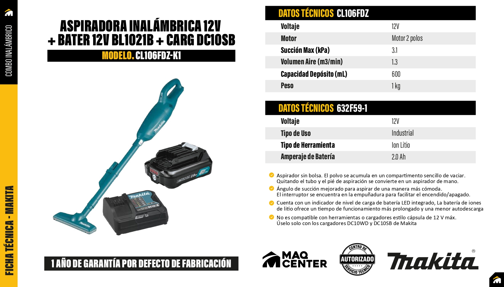 Aspiradora inalámbrica 12v 600ml + batería 12v 2.0ah bl1021b + cargador dc10sb makita
