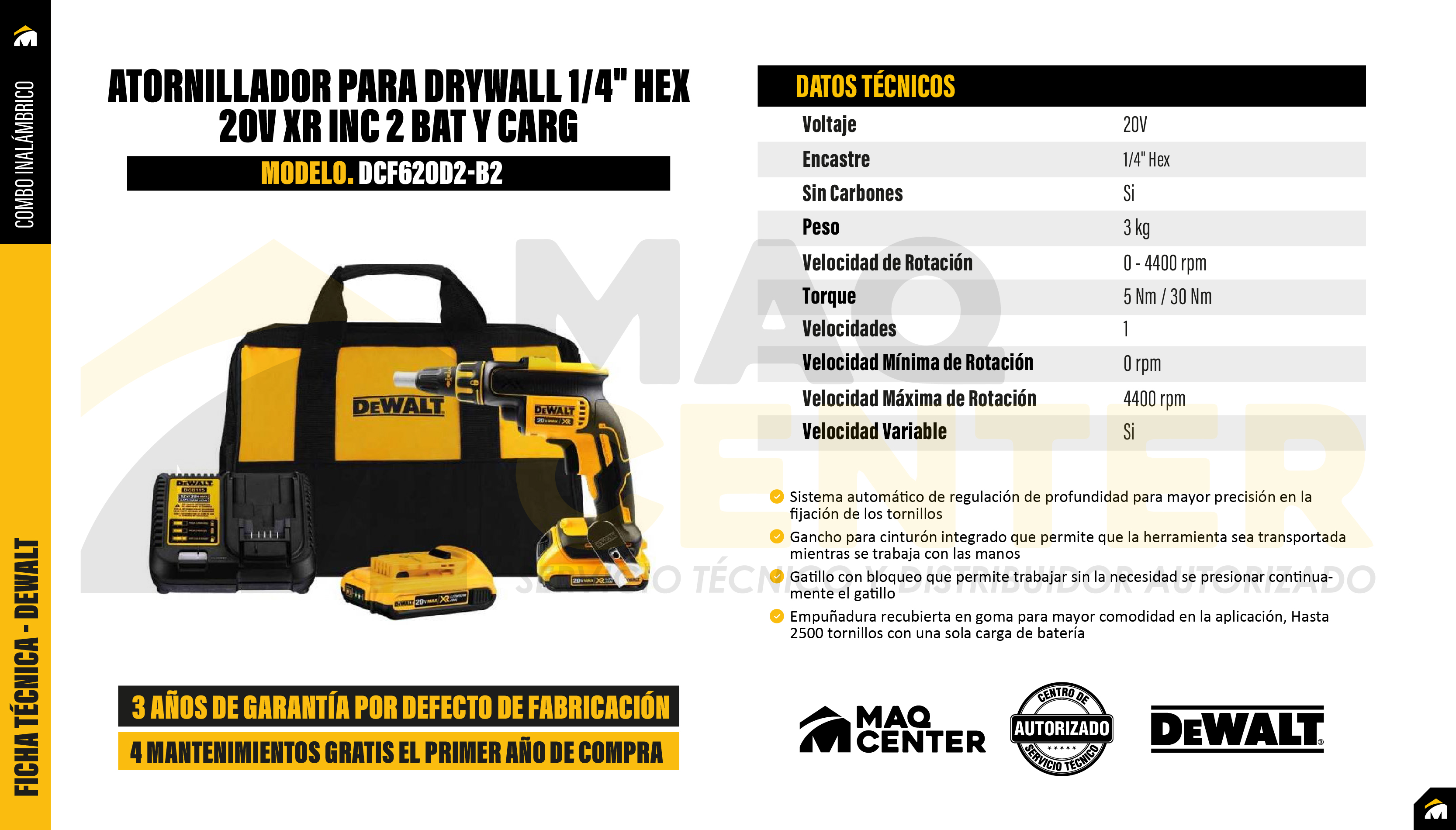 Atornillador para drywall 1/4'' 20v xr inc 2bat y carg dewalt dcf620d2-b2
