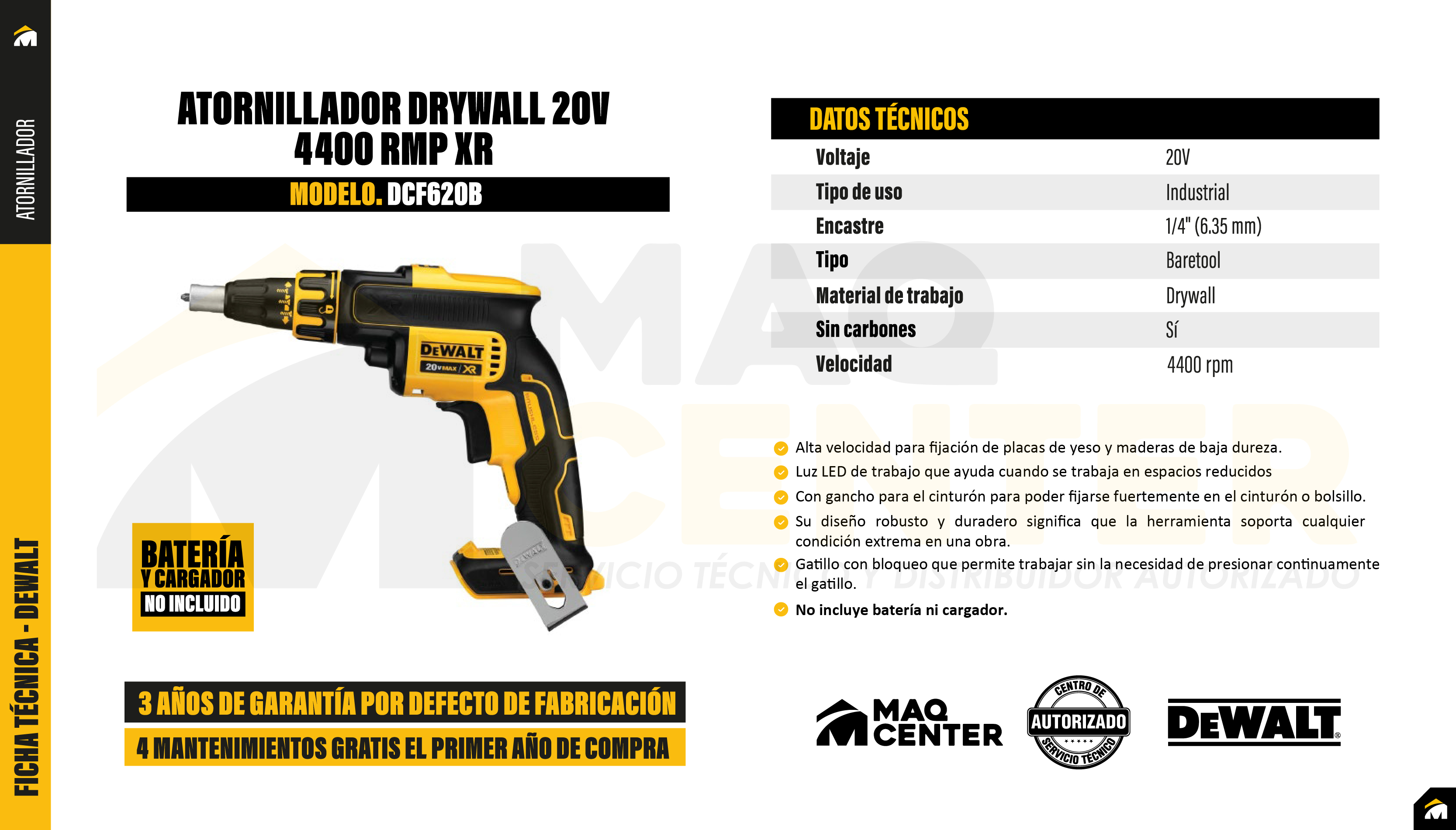 Alta velocidad para fijación de placas de yeso y maderas de baja dureza. Sistema automático de regulación de profundidad para mayor precisión en la fijación de los tornillos. Motor sin carbones (brushless) ofrece más de tiempo de ejecución que las herramientas con carbones.