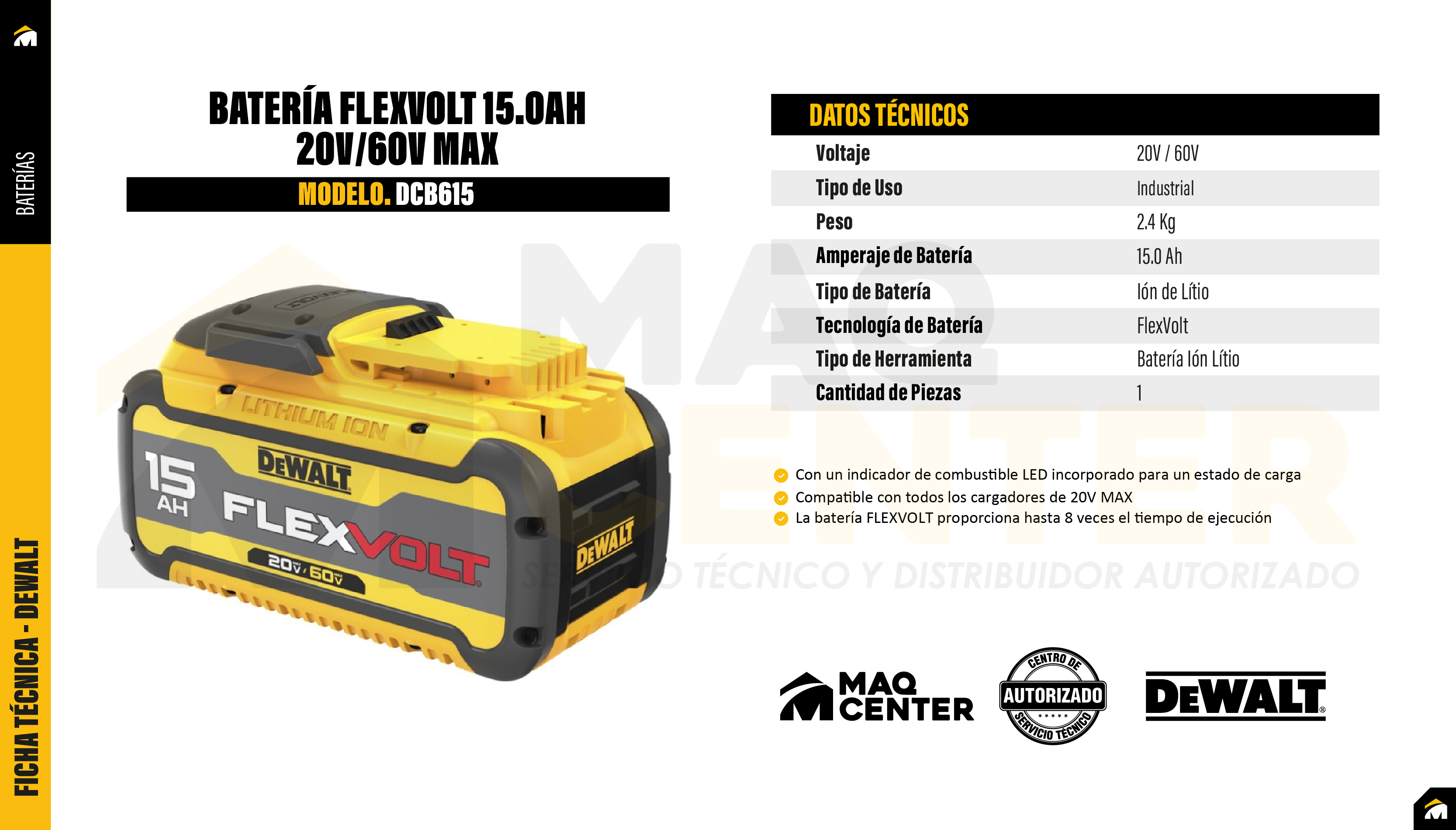 Batería ion litio 20v/60v flexvolt 15.0 ah dewalt dcb615