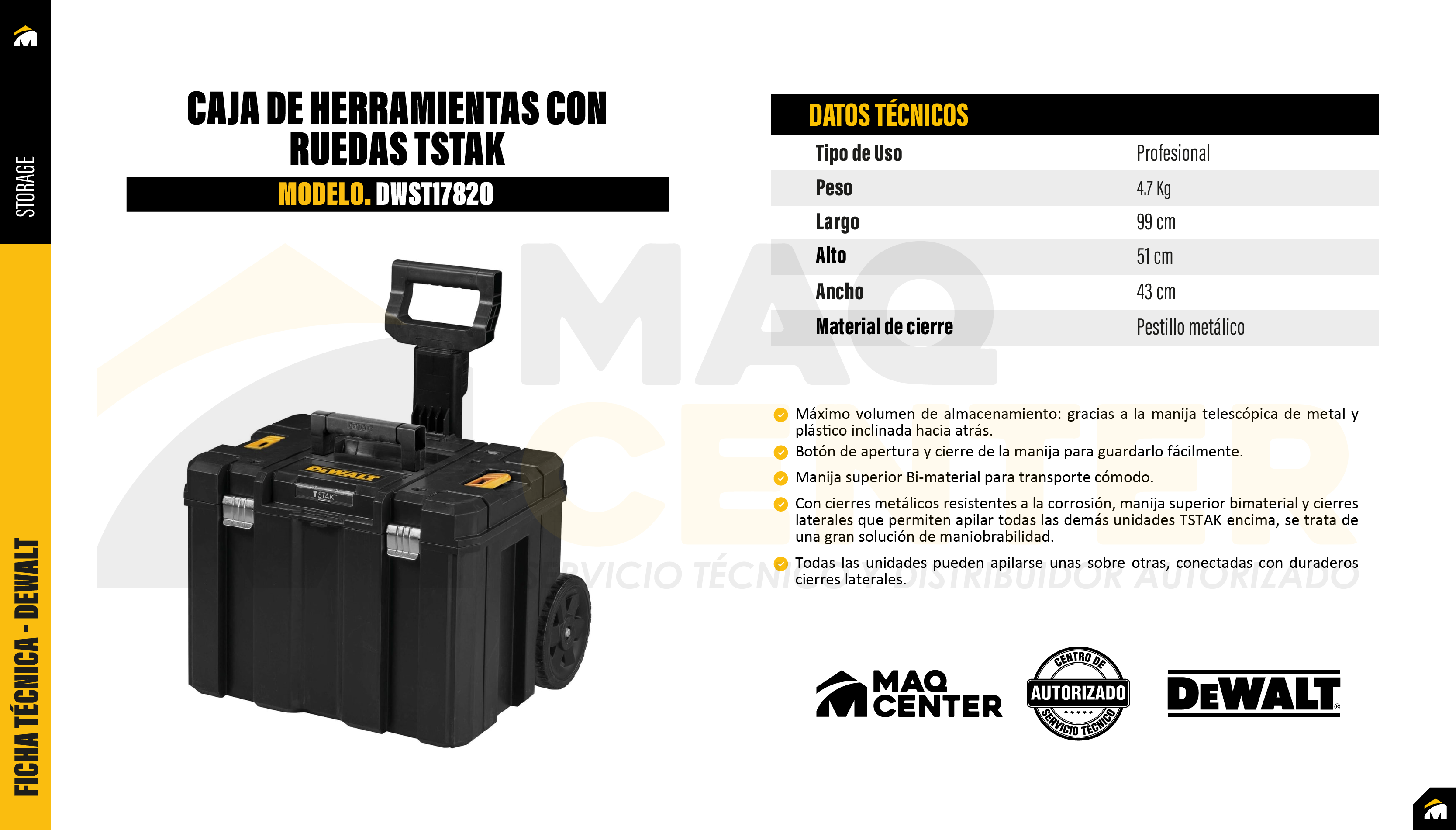 La unidad de almacenamiento móvil DEWALT® TSTAK® combina una caja de herramientas de gran volumen de almacenamiento con ruedas duraderas de 17cm. Con cierres metálicos resistentes a la corrosión, manija superior bimaterial y cierres laterales que permiten apilar todas las demás unidades TSTAK encima, se trata de una gran solución de maniobrabilidad.