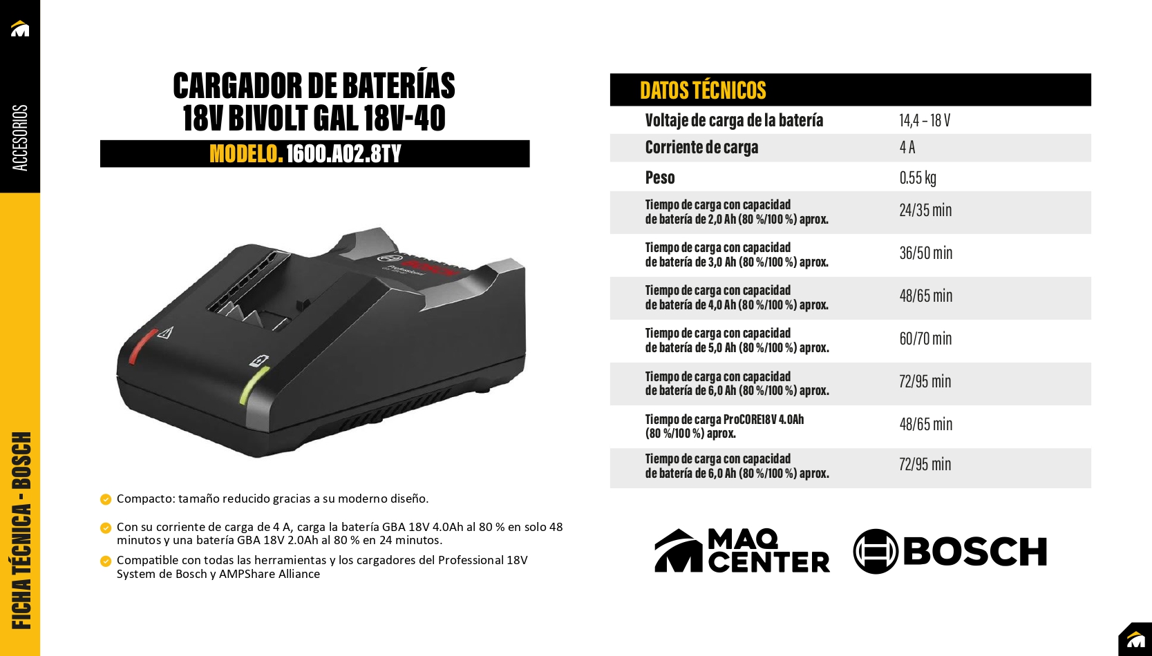 Ofrece una carga rápida y eficiente, ideal para trabajos que requieren mínima interrupción.