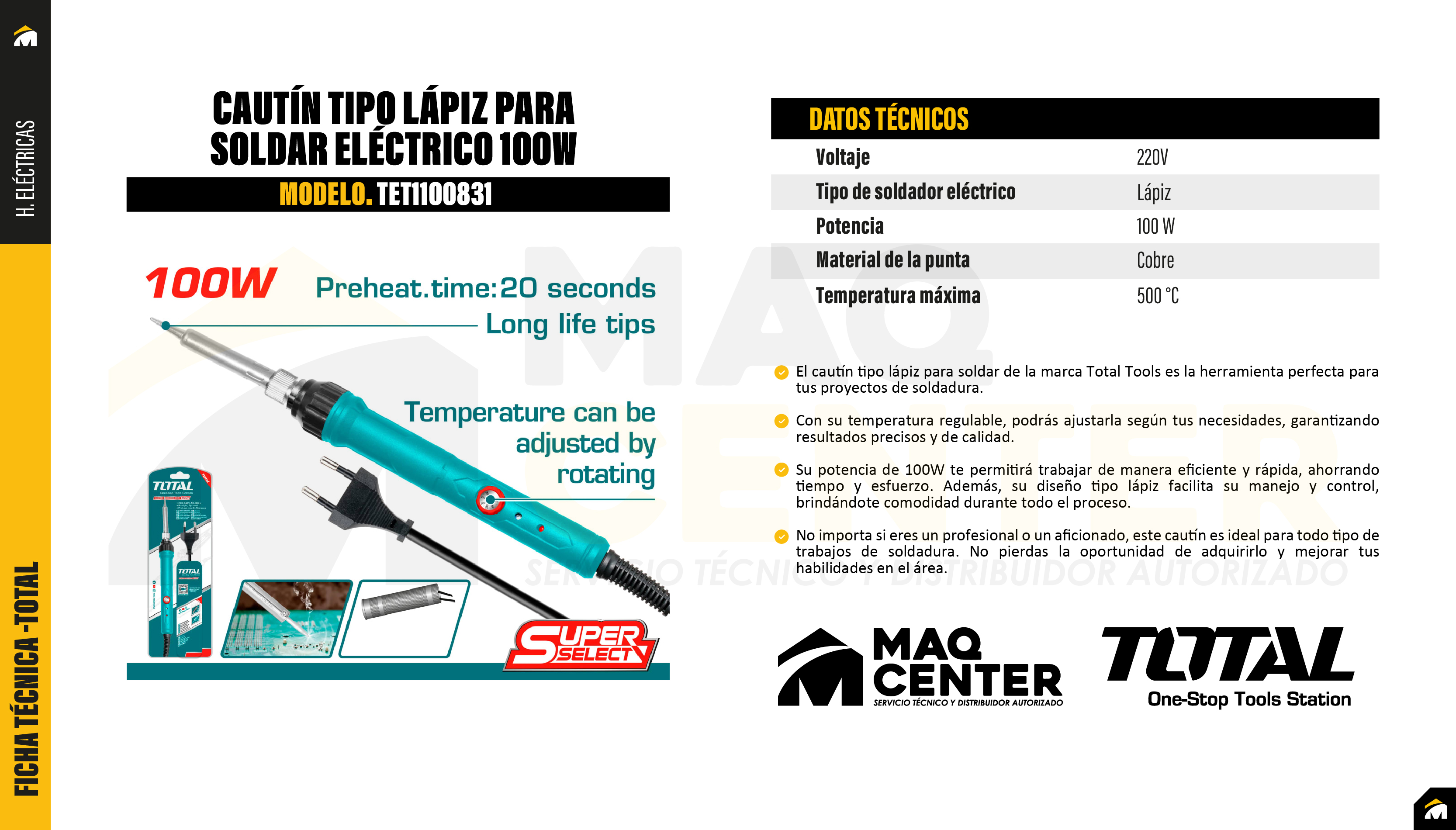 Cautín tipo lápiz para soldar eléctrico 100w total tet1100831