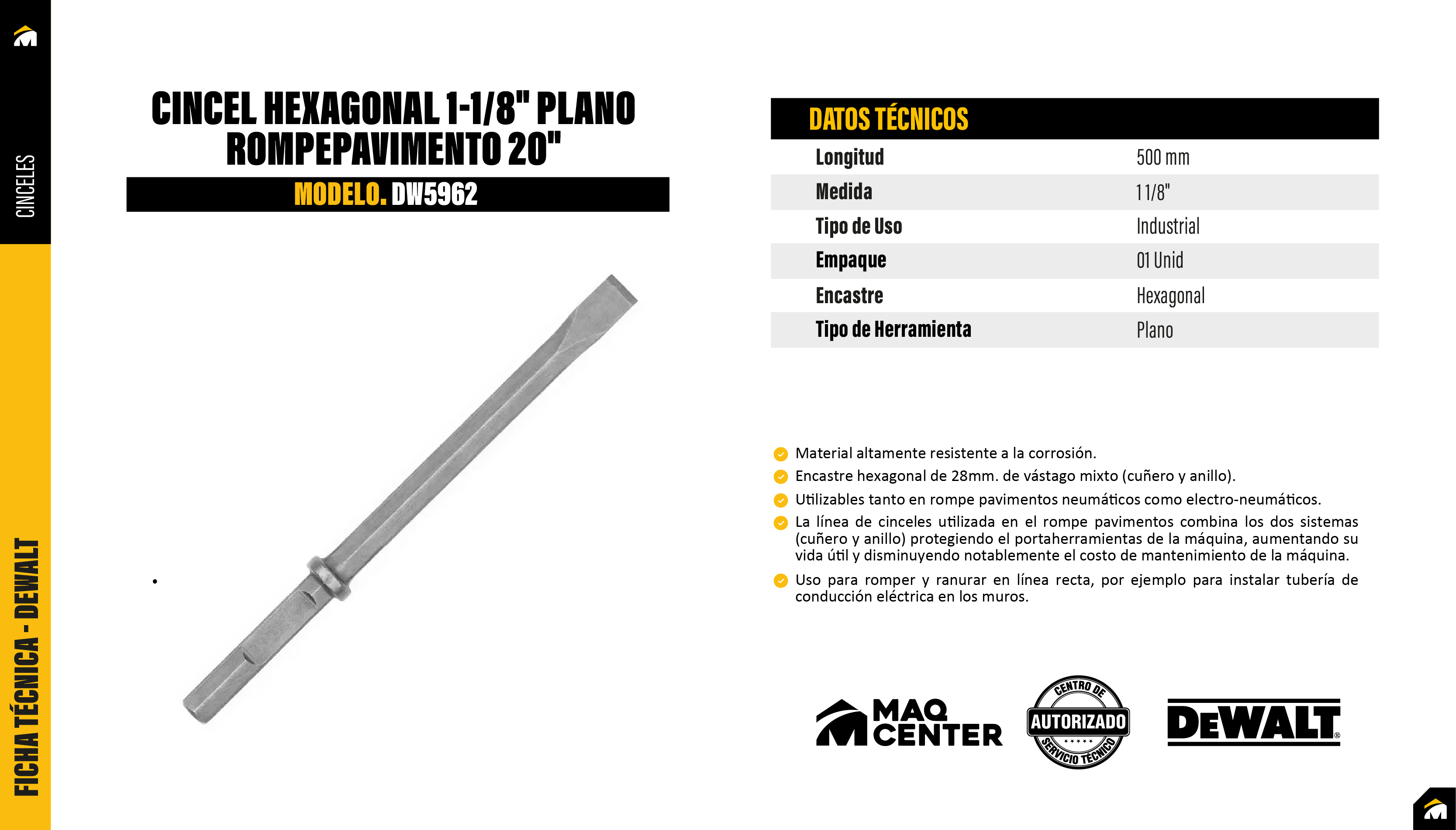 Cincel hexagonal plano 1-1/8 - 20 para rompepavimento (dw5962)