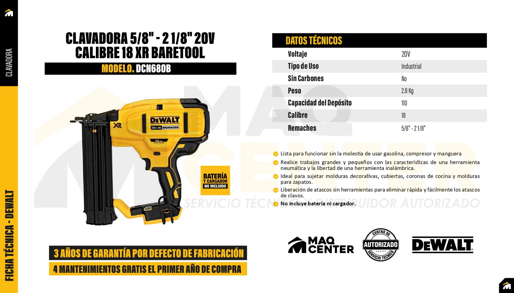 La clavadora inalámbrica DEWALT DCN680B de 20V XR está diseñada para trabajos de acabado con clavos calibre 18, en rangos de 5/8" a 2-1/8". Es perfecta para instalar molduras, zócalos, marcos y otros detalles de carpintería fina, brindando un acabado limpio y profesional sin necesidad de compresores o mangueras. Su motor brushless garantiza mayor eficiencia, autonomía y una vida útil prolongada, ideal para uso frecuente en obra o taller.