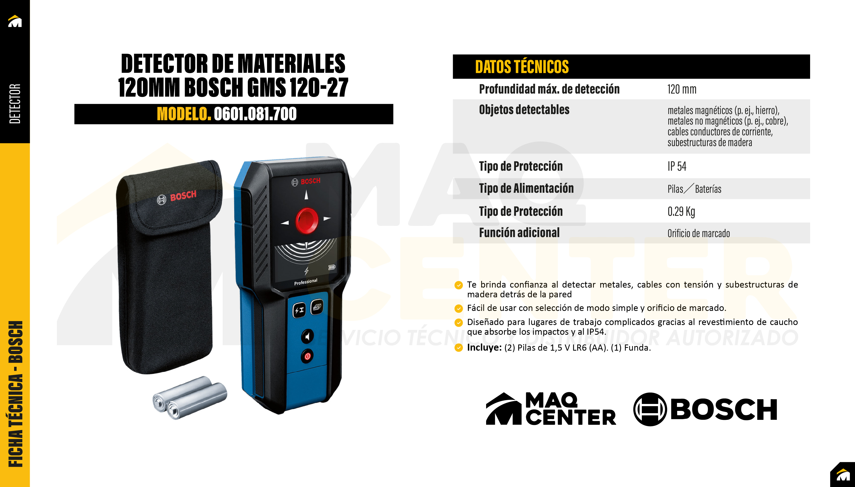 Claro y sencillo: el detector de pared intuitivo que hace visible lo invisible Te brinda confianza al detectar metales, cables con tensión y subestructuras de madera detrás de la pared. Fácil de usar con selección de modo simple y orificio de marcado. Diseñado para lugares de trabajo complicados gracias al revestimiento de caucho que absorbe los impactos y al IP54