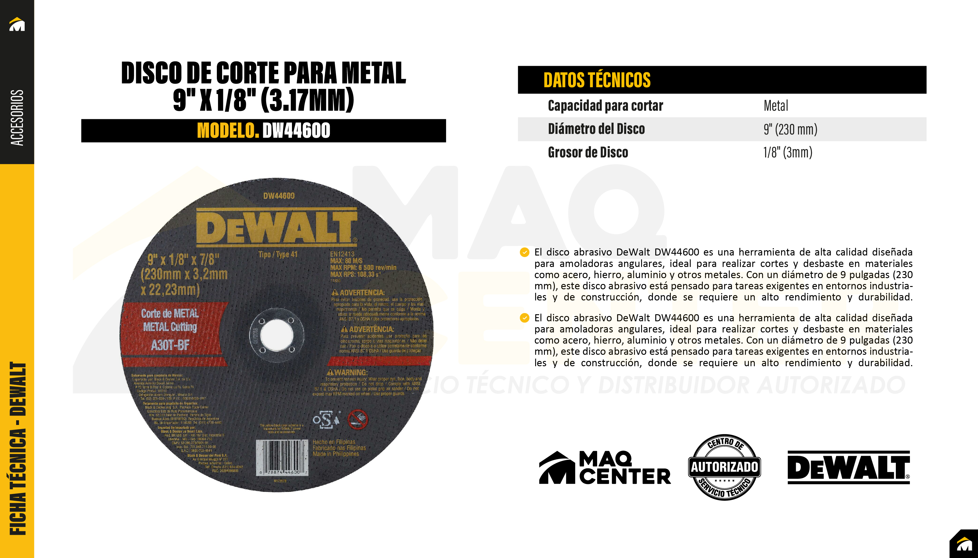 El disco abrasivo DeWalt DW44600 es una herramienta de alta calidad diseñada para amoladoras angulares, ideal para realizar cortes y desbaste en materiales como acero, hierro, aluminio y otros metales. Con un diámetro de 9 pulgadas (230 mm), este disco abrasivo está pensado para tareas exigentes en entornos industriales y de construcción, donde se requiere un alto rendimiento y durabilidad.