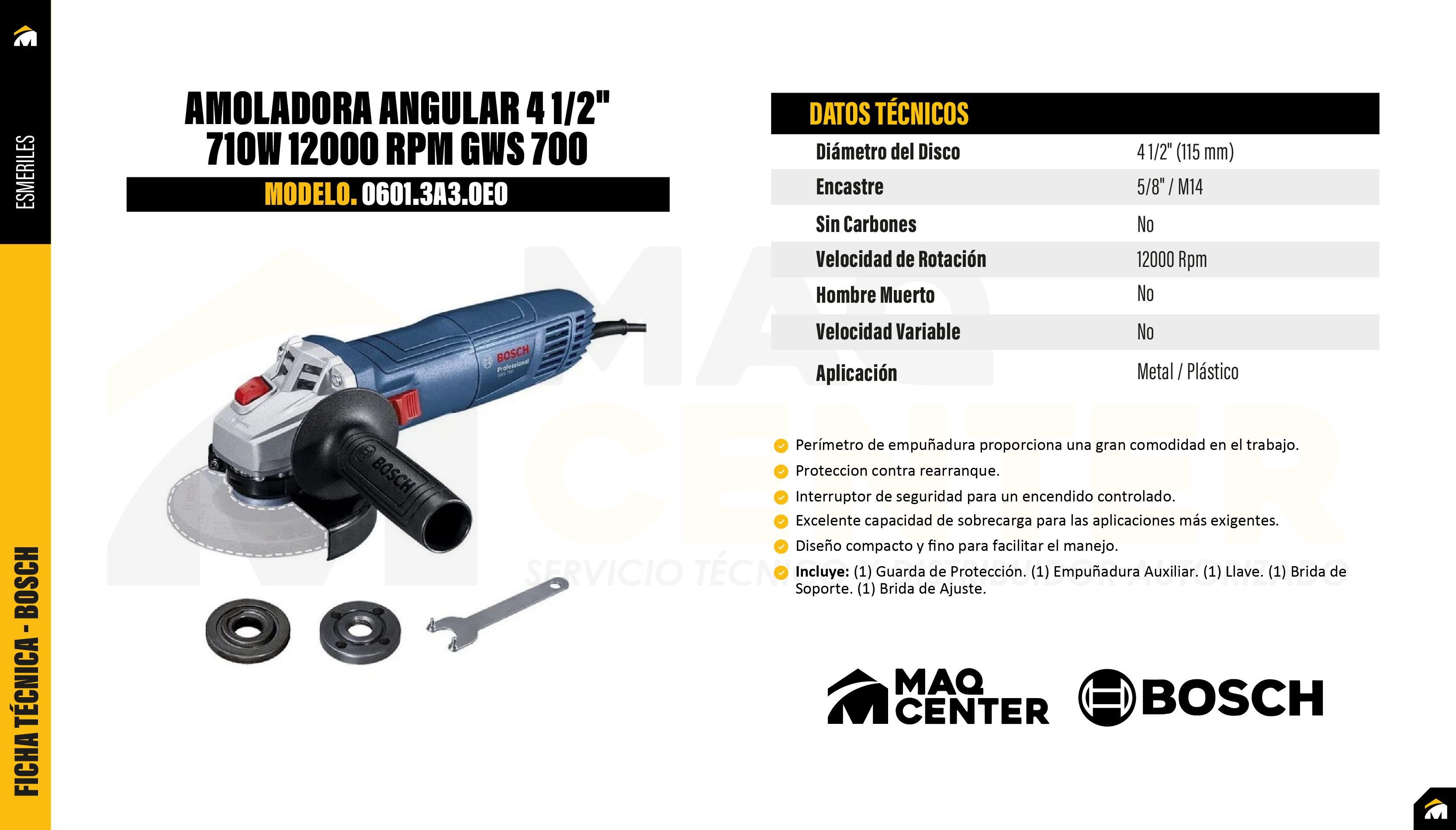 La Amoladora Bosch GWS 700 tiene 710W de potencia y es una herramienta liviana. Con bajo costo de mantenimiento, ya que su motor tiene una larga vida útil de las escobillas de carbón. Su diseño es optimizado y tiene una empuñadura ergonómica. La Amoladora Bosch GWS 700 tiene entradas de aire redobladas para una mejor refrigeración de la máquina.