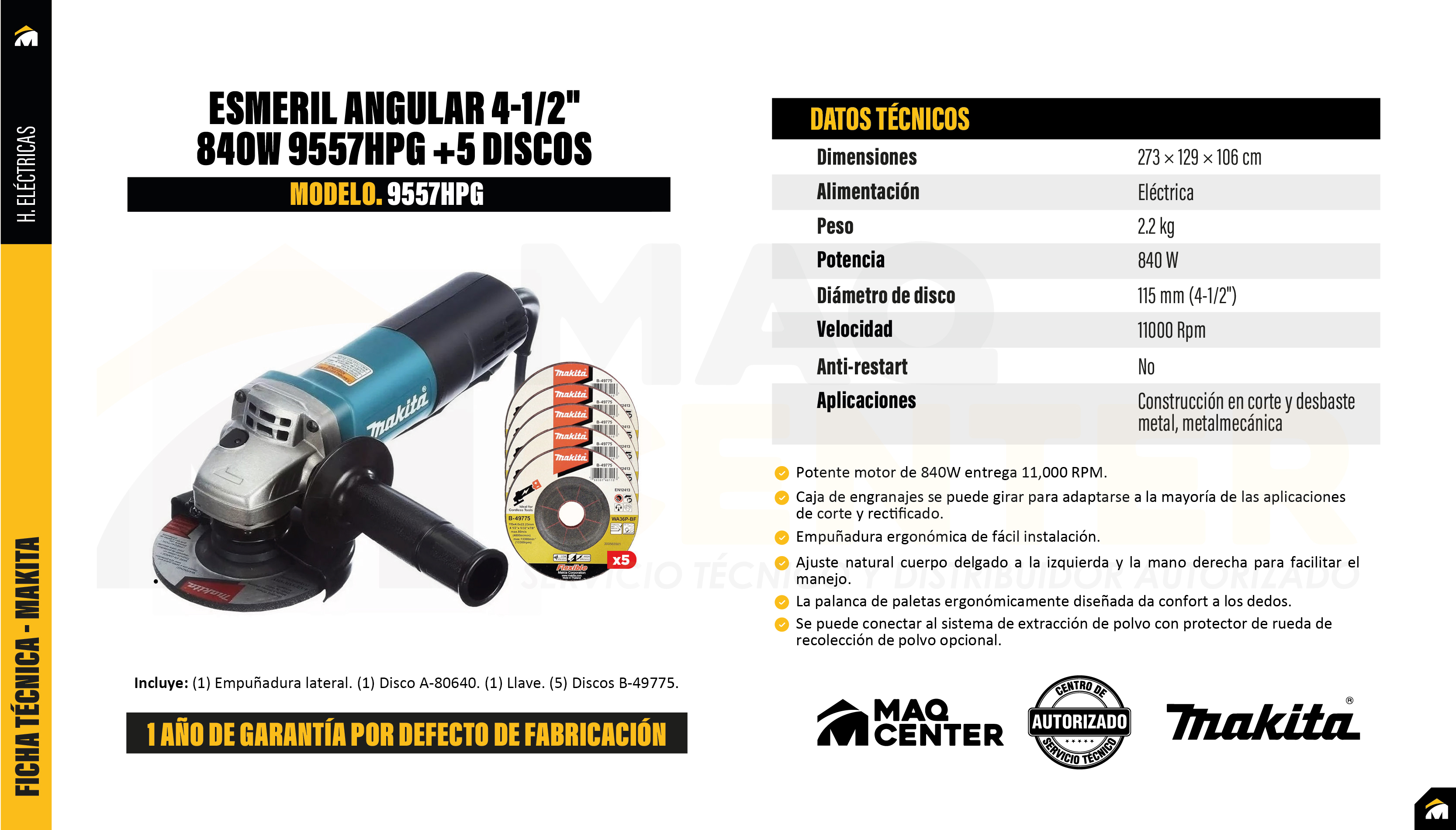 Esmeril angular 4.5" 850w 9557hpg makita +10 discos de corte d-72001