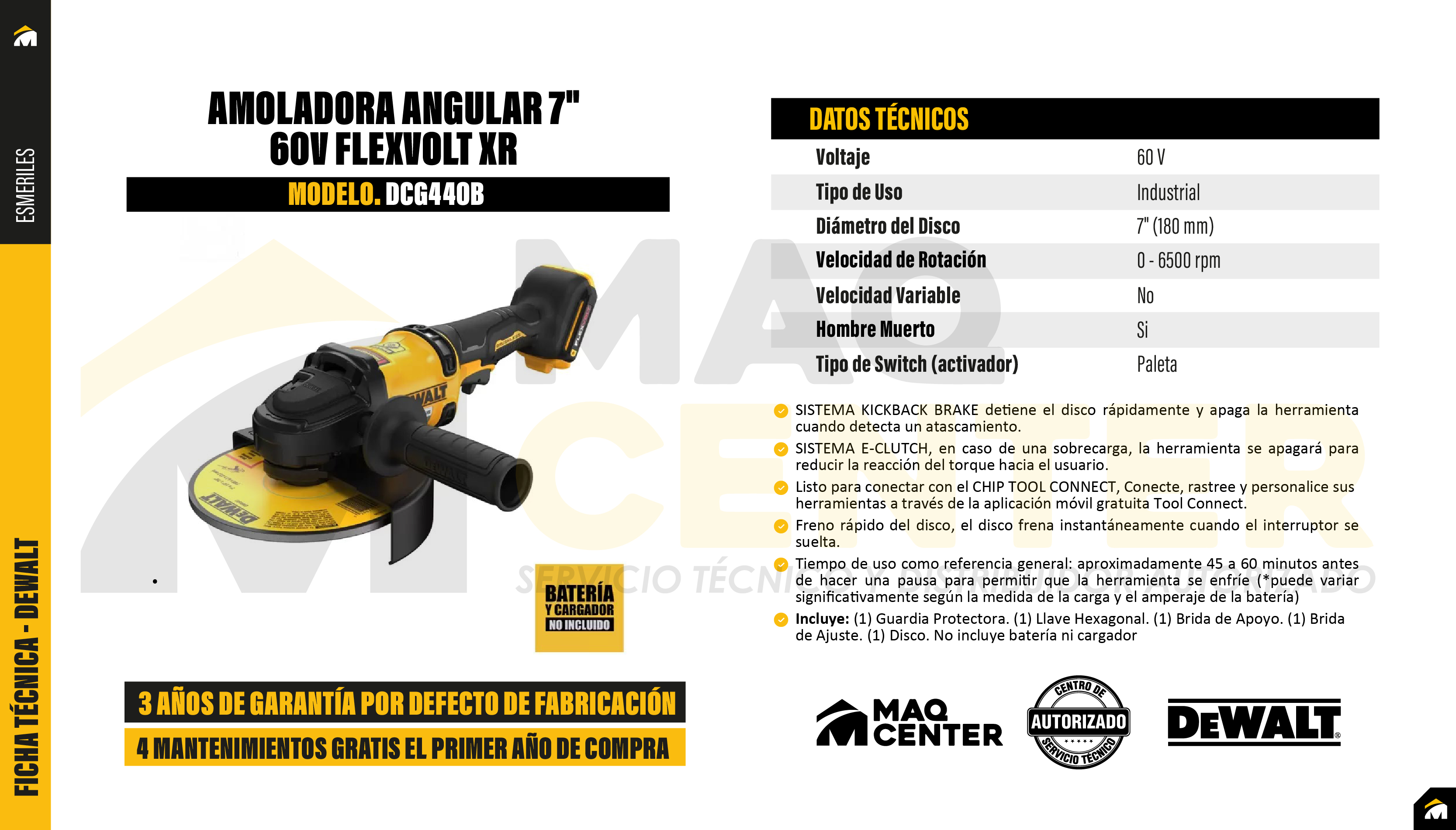 La esmeriladora angular DEWALT DCG440B-B2 de 7" y 60V FLEXVOLT está diseñada para tareas de corte y desbaste exigentes en metal, concreto y otros materiales de alta resistencia. Su motor brushless de alto rendimiento entrega una potencia equivalente a ~3 HP y alcanza hasta 6 500 rpm, brindando una capacidad de trabajo comparable a modelos con cable, pero con la libertad de una herramienta inalámbrica. Gracias a su tamaño de disco de 7", permite realizar cortes más profundos y eficientes en menos tiempo.