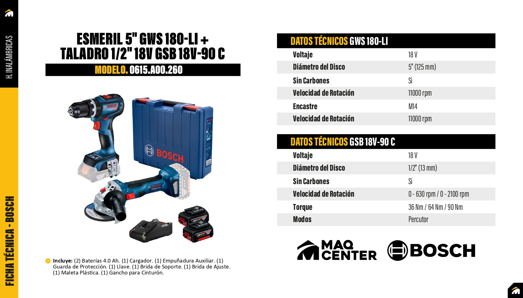 Esmeril angular bosch 5'' gws 180 + taladro perc 1/2'' + 2 bat y carg - 0615.a00.260