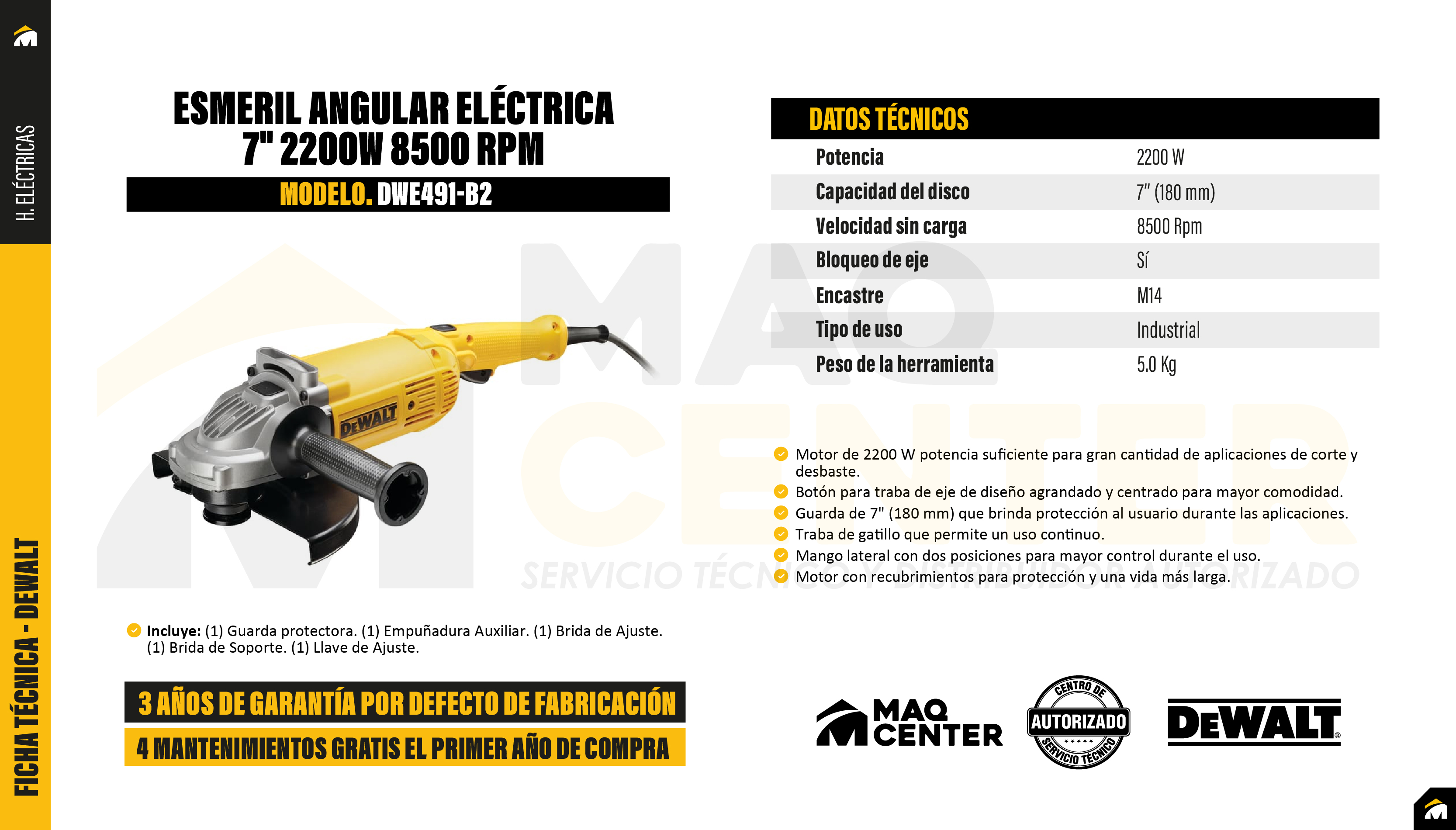 Esmeril angular eléctrica 7" 2200w 8500 rpmdewalt dwe491-b2