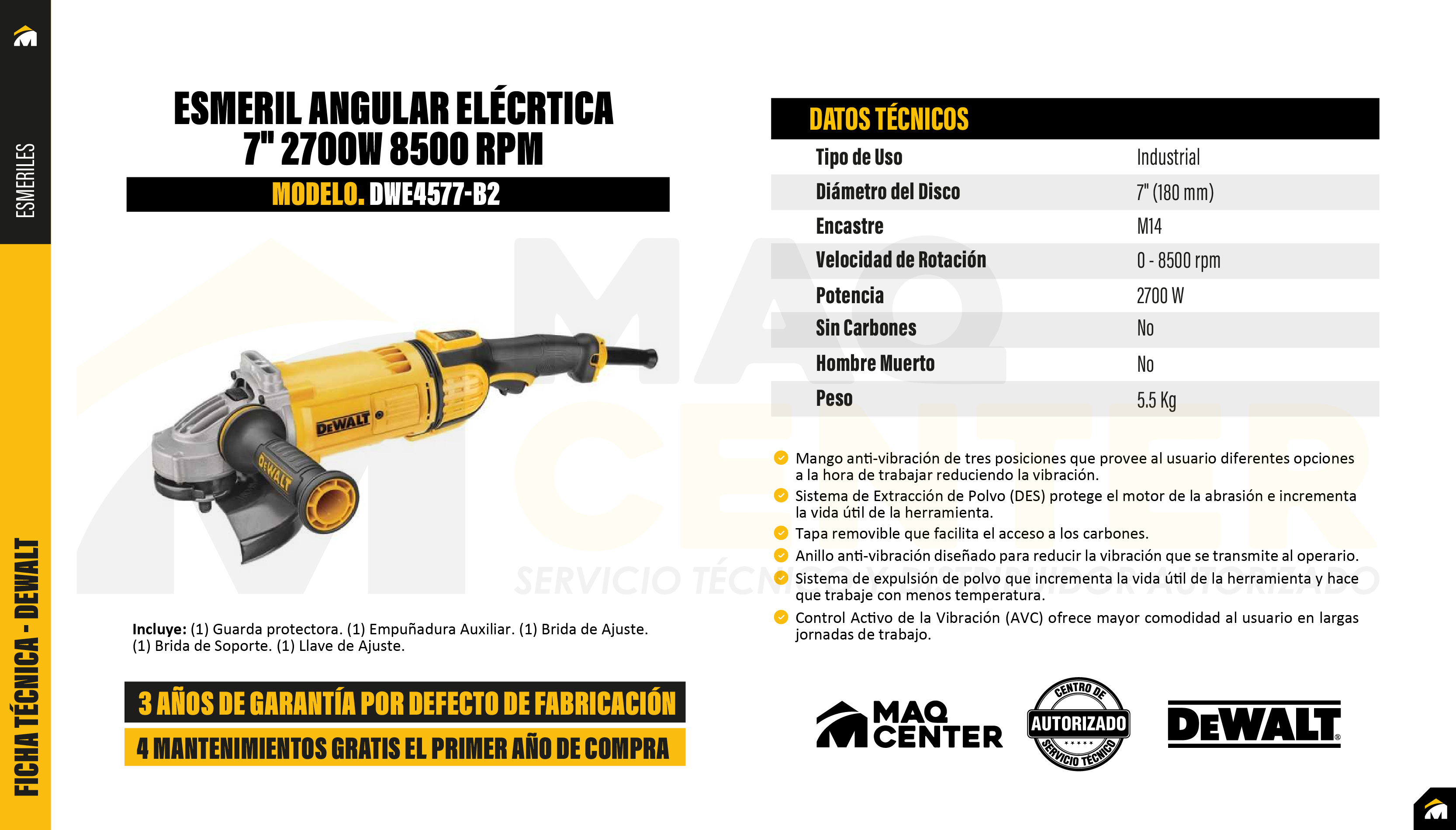 Esmeril angular eléctrica 7" 2700w 8500 rpm dewalt dwe4577-b2