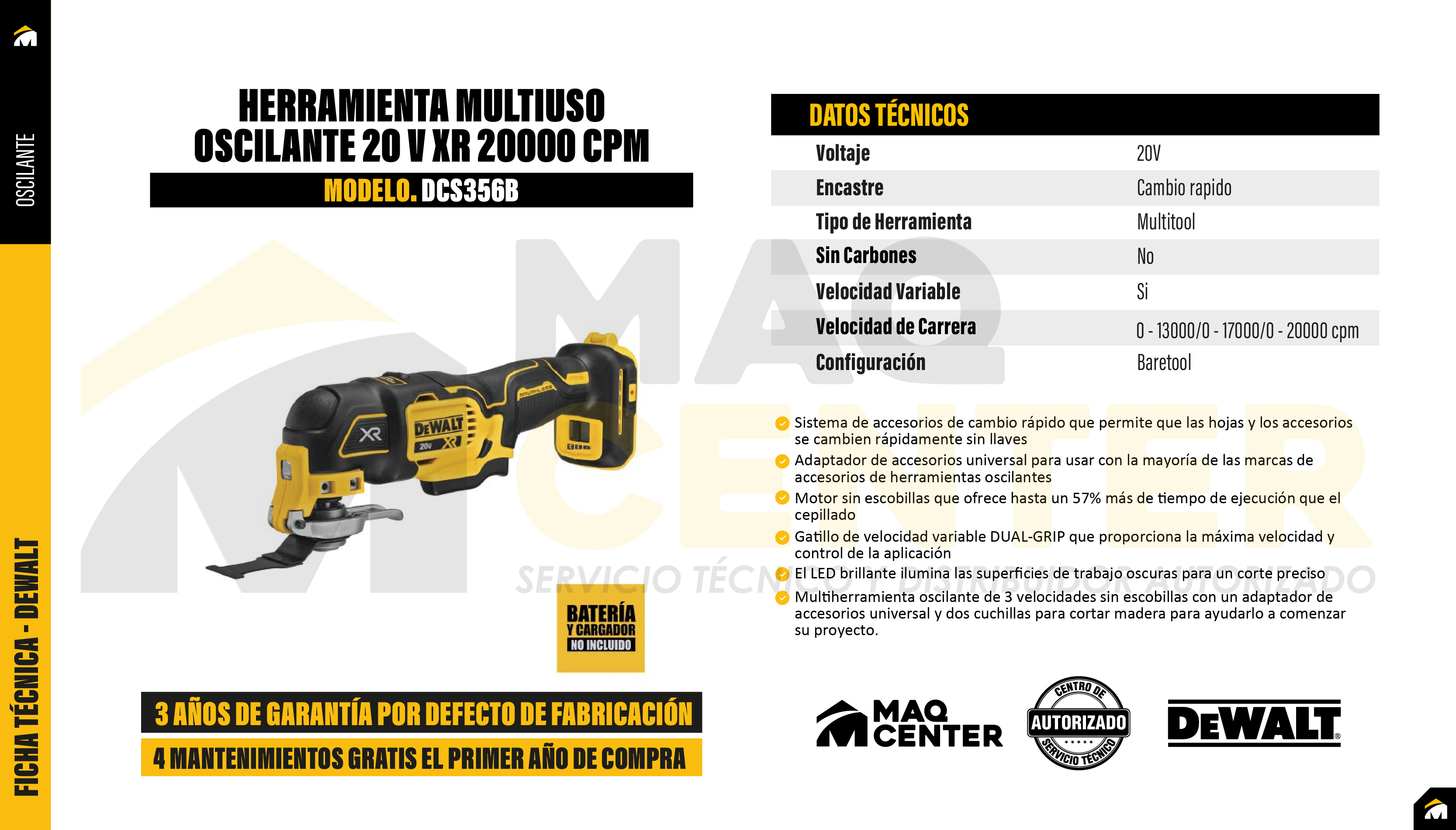 Velocidad variable de hasta 20,000 cpm para cortes, lijado, raspado y más. Selector de 3 velocidades para mejor control según la aplicación. Sistema de cambio rápido de accesorios sin herramientas. Versión baretool (sin batería ni cargador), compatible con el sistema 20V MAX.