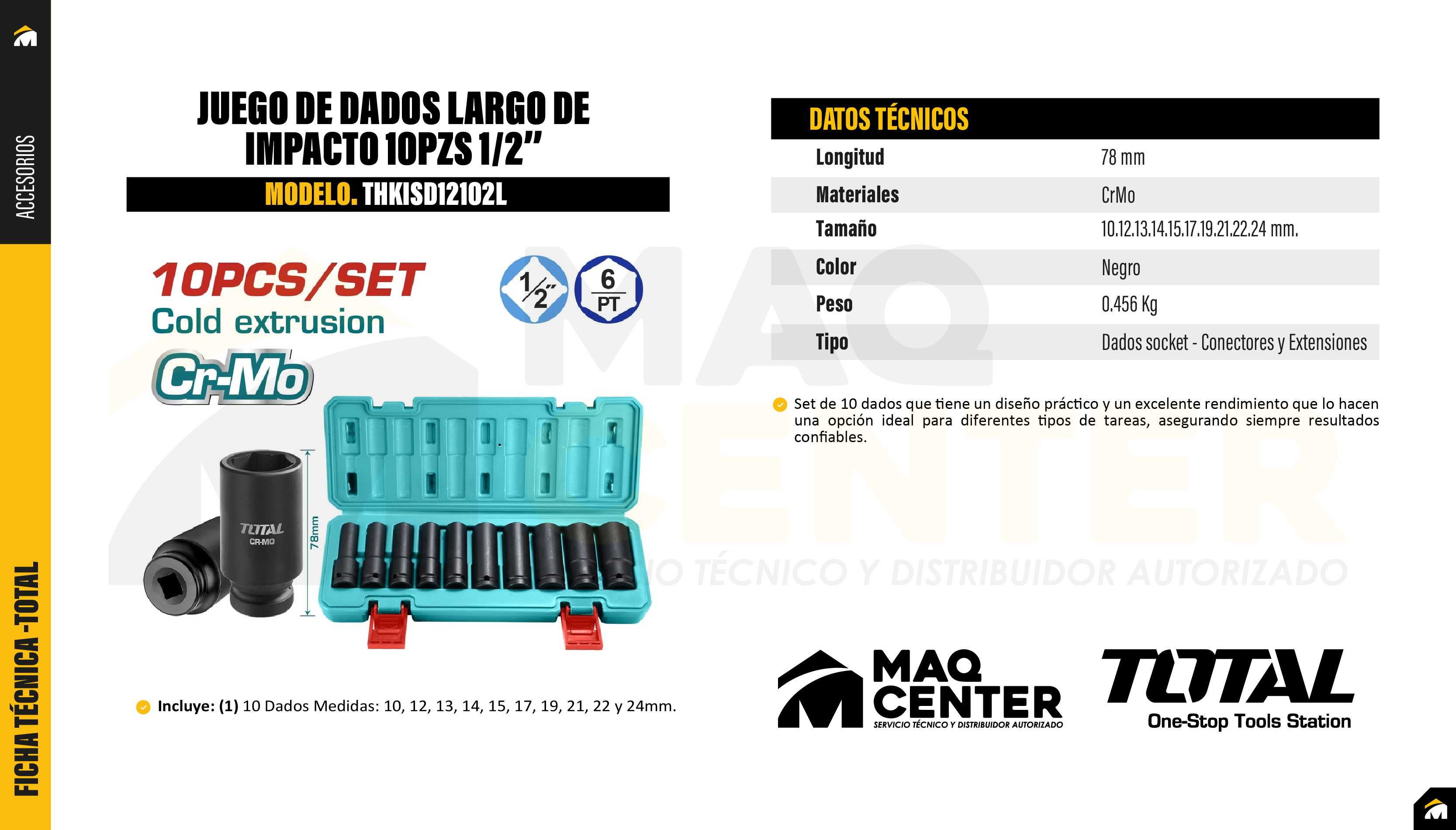 Juego de dados largo de impacto 10pzs 12 x 78mm total thkisd12102l