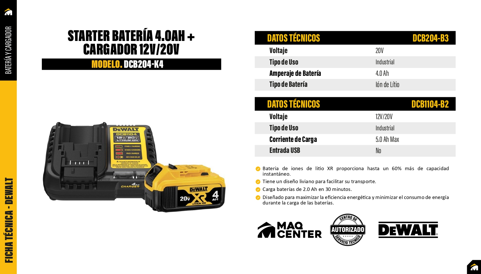 Bateria Premium Compacta Ion Litio 20v Max 4.0ah Dewalt DCB204-B3: Diseño Premium Carga súper rápida Diseño ligero para menos fatiga de uso Ofrece hasta un 33% mas de tiempo de uso por carga de los de su clase. 3 indicadores LED. Las baterías de Ion Litio DeWalt son referentes de potencia y calidad. Frente a sus competencias directas se destacan por ser eficientes, duraderas y totalmente portátiles. Su diseño compacto es ideal para llevarlo a todos lados donde el trabajo lo requiera. La tecnología que se emplea para su fabricación ha sido puesta a prueba en los más rigurosos exámenes y han soportado óptimamente cada una de ellas. Definitivamente es la compañera ideal para cada producto de la línea de herramientas eléctricas DeWalt.