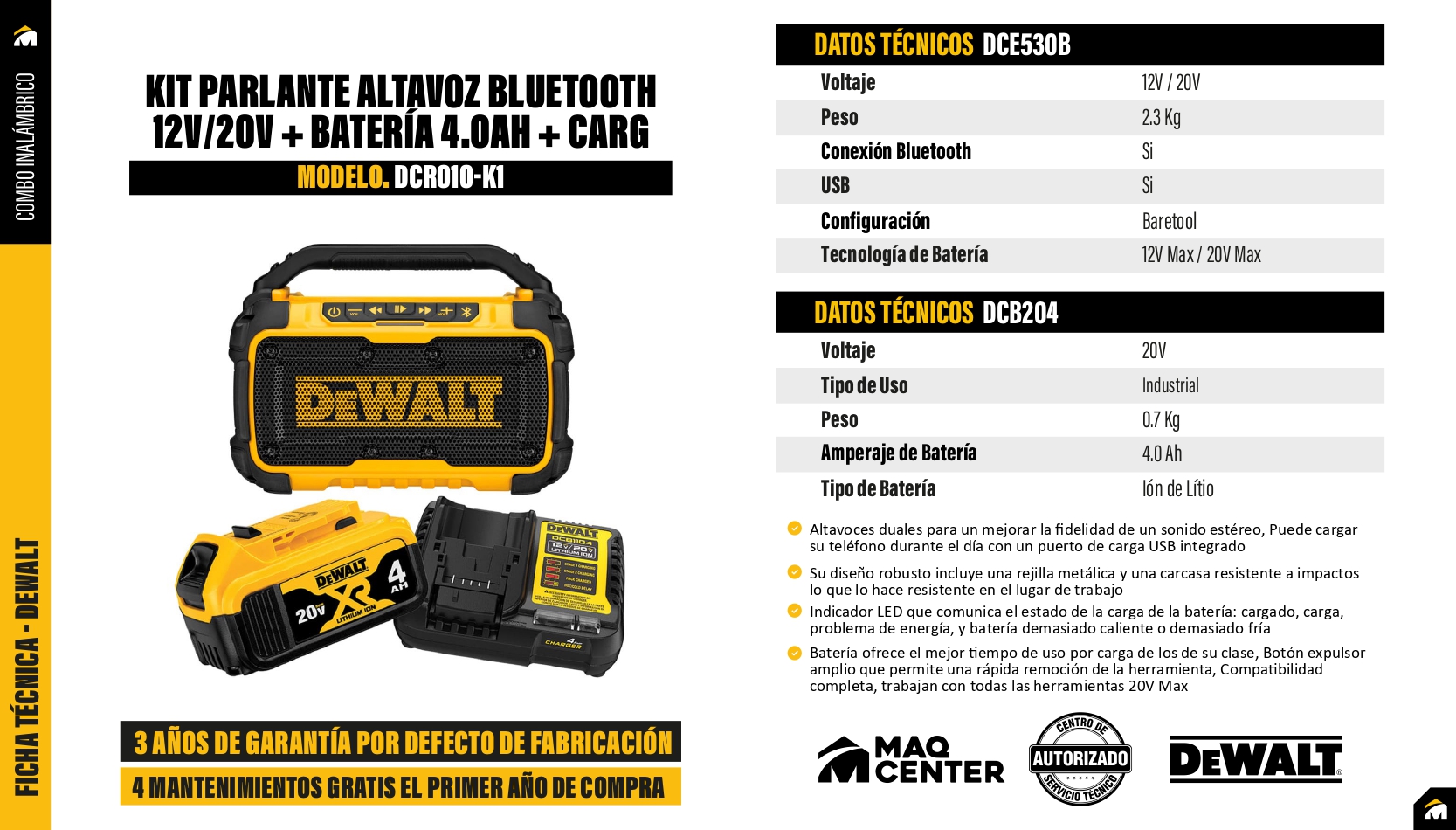El puerto bass reflex mejora el rendimiento de baja frecuencia Este altavoz Bluetooth es resistente en el lugar de trabajo y produce un sonido de alta calidad. Mejore su día laboral transmitiendo su música o podcasts favoritos desde su dispositivo móvil equipado con Bluetooth® desde una distancia de hasta 100 pies. También puede enchufar dispositivos directamente con la entrada auxiliar. Cargue su teléfono durante el día con un puerto de carga USB integrado. Coloque su teléfono móvil en la ranura del asa de transporte incorporada, o debajo. Disfrute de un sonido estéreo rico con graves extendidos desde altavoces duales de 3 pulgadas. Su diseño robusto incluye una rejilla metálica y una carcasa resistente a los golpes. Alimente el altavoz Bluetooth® Jobsite con baterías DEWALT 12V MAX *, 20V MAX * o FLEXVOLT®