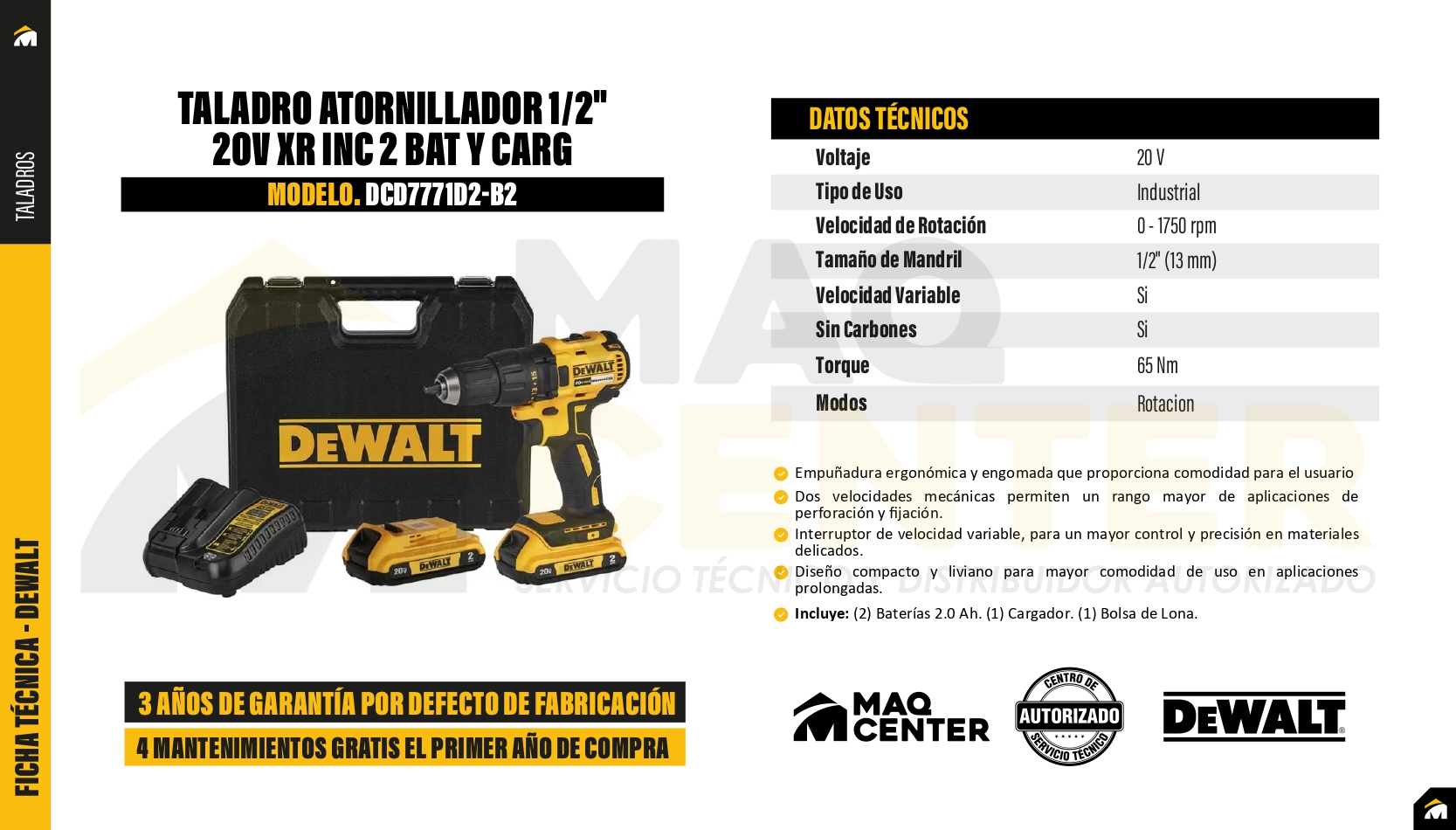 Kit taladro dewalt 20v xr brushless + 2 baterías dcd7771d2-b2