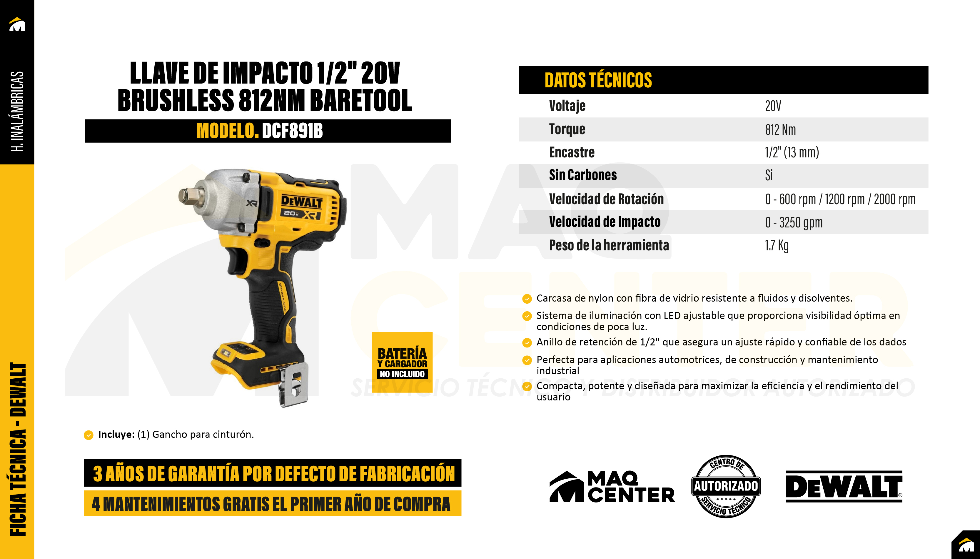 Llave de impacto dewalt 1/2" 20v 812nm (sin batería) - dcf891b