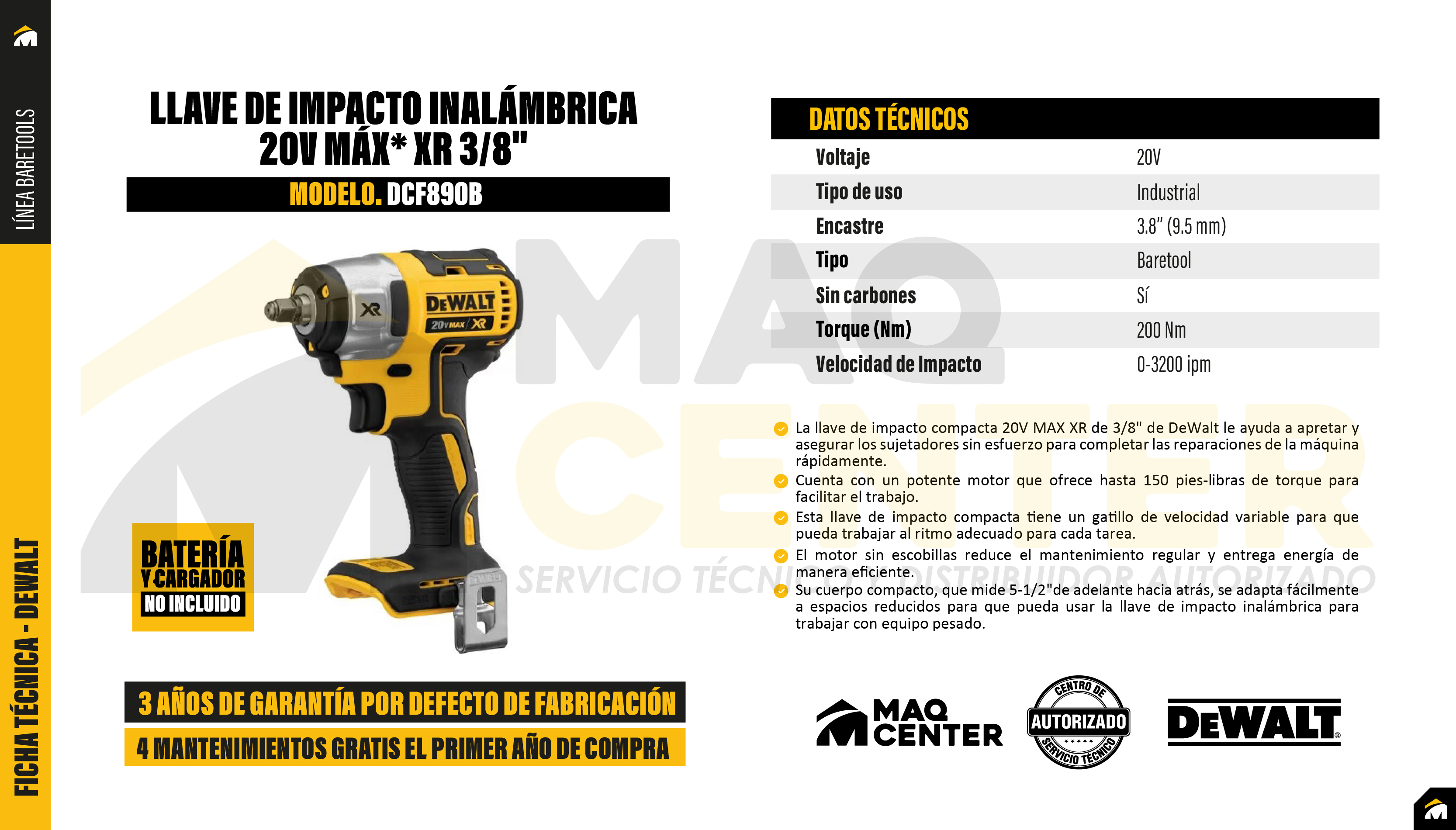 Compacto y ergonómico con solo 5.5 "de largo de cabeza y 2 libras (solo herramienta). Motor sin escobillas construido por DeWalt para mayor eficiencia y tiempo de ejecución. Par máximo de 150 pies-libras en un paquete compacto para una variedad de diferentes aplicaciones de fijación. 3 LED y un clip para cinturón para mayor facilidad de uso. El diseño compacto y liviano es excelente para usar en áreas estrechas. Las baterías y Cargador se venden por Separado. La llave de impacto compacta 20V MAX XR de 3/8" de DeWalt le ayuda a apretar y asegurar los sujetadores sin esfuerzo para completar las reparaciones de la máquina rápidamente. Cuenta con un potente motor que ofrece hasta 150 pies-libras de torque para facilitar el trabajo. Esta llave de impacto compacta tiene un gatillo de velocidad variable para que pueda trabajar al ritmo adecuado para cada tarea. El motor sin escobillas reduce el mantenimiento regular y entrega energía de manera eficiente. Su cuerpo compacto, que mide 5-1 / 2 pulgadas de adelante hacia atrás, se adapta fácilmente a espacios reducidos para que pueda usar la llave de impacto inalámbrica para trabajar con equipo pesado. La luz de trabajo LED de esta herramienta le permite ver lo que está haciendo en espacios oscuros.