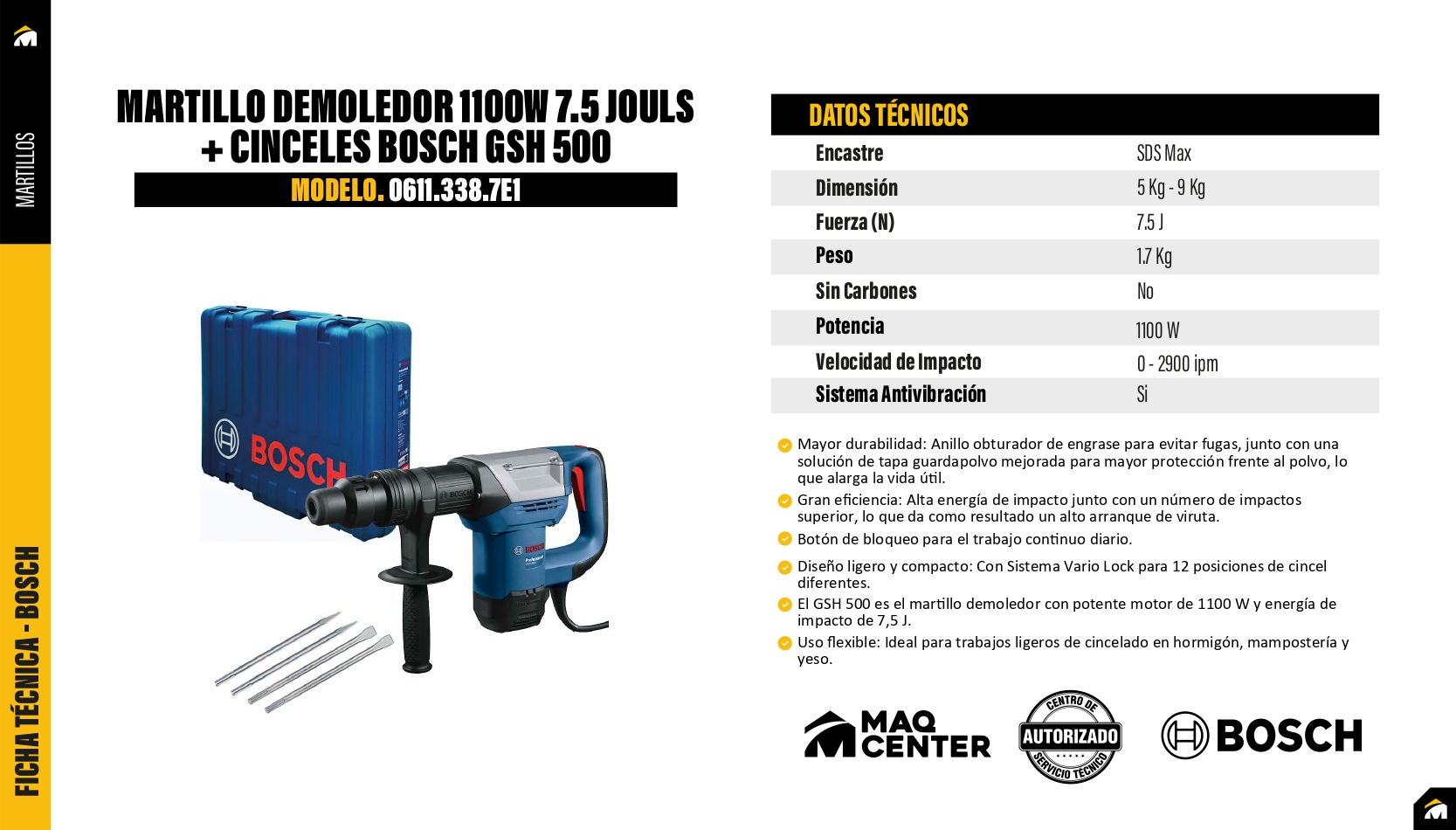 Martillo demoledor 1100w 7.5 jouls + cinceles bosch gsh 500