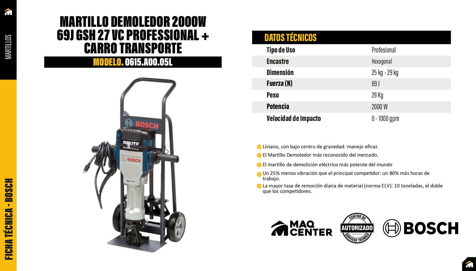Martillo demoledor 2000w gsh 27 vc + carro transporte bosch