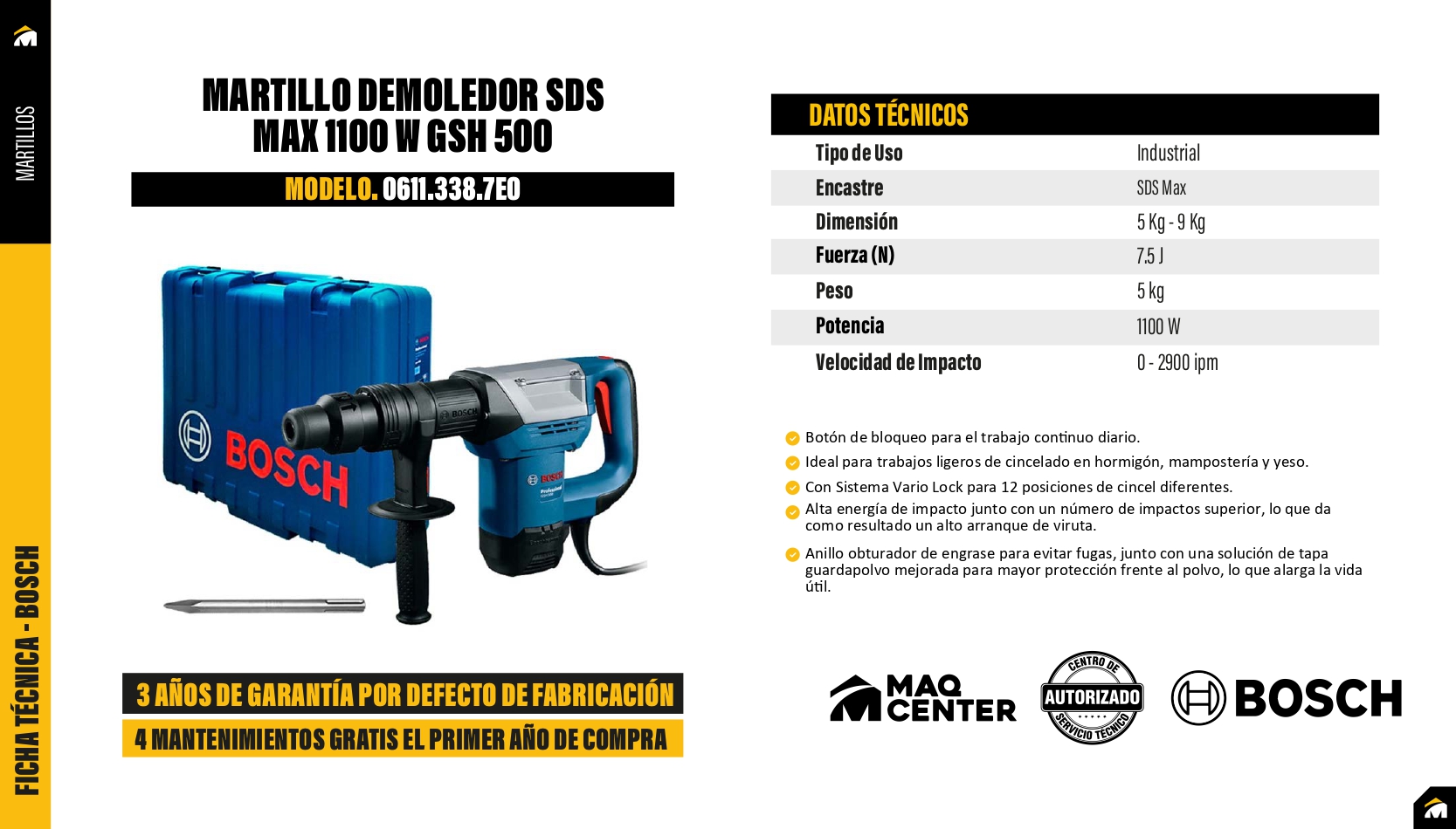 Potencia de Impacto (7.5 J): Energía suficiente para demoler concreto, remover azulejos y abrir zanjas en paredes de forma rápida y eficiente.