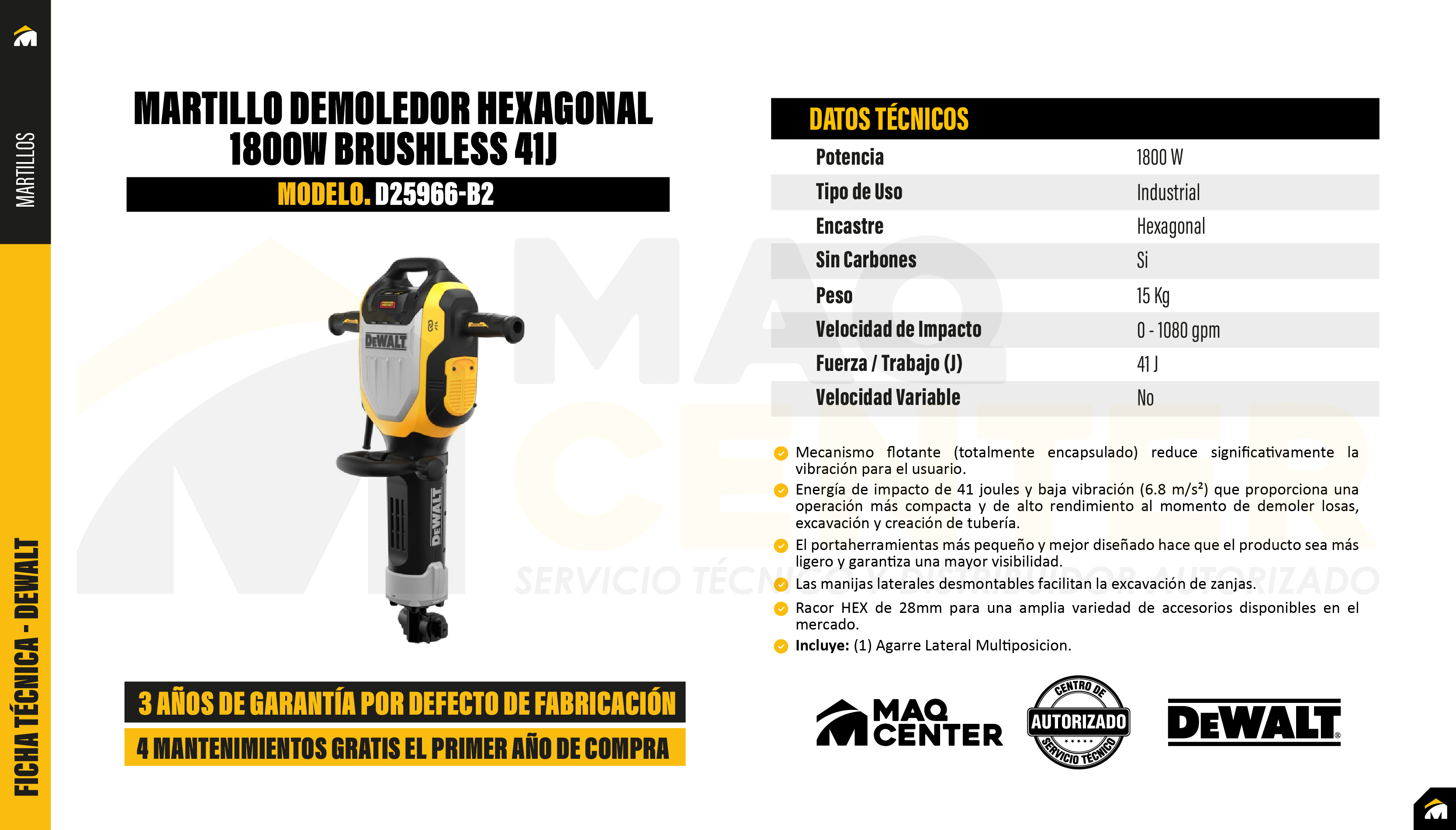 Mecanismo flotante (totalmente encapsulado) reduce significativamente la vibración para el usuario. Energía de impacto de 41 julios y baja vibración (6.8 m/s²) que proporciona una operación más compacta y de alto rendimiento al momento de demoler losas, excavación y creación de tubería. El portaherramientas más pequeño y mejor diseñado hace que el producto sea más ligero y garantiza una mayor visibilidad. Las manijas laterales desmontables facilitan la excavación de zanjas. Racor HEX de 28mm para una amplia variedad de accesorios disponibles en el mercado. Indicador de servicio LED, para facilitar la identificación del momento adecuado para el mantenimiento. Fácil acceso para reparación o reemplazo de cables. Sistema de control de herramientas que le permite emparejar la herramienta con otro dispositivo de control de herramientas inalámbrico, como un extractor de polvo, para activación y apagado automáticos. Emplee el martillo demoledor solo para el propósito para el que está diseñado, no lo utilices de manera inapropiada o peligrosa.