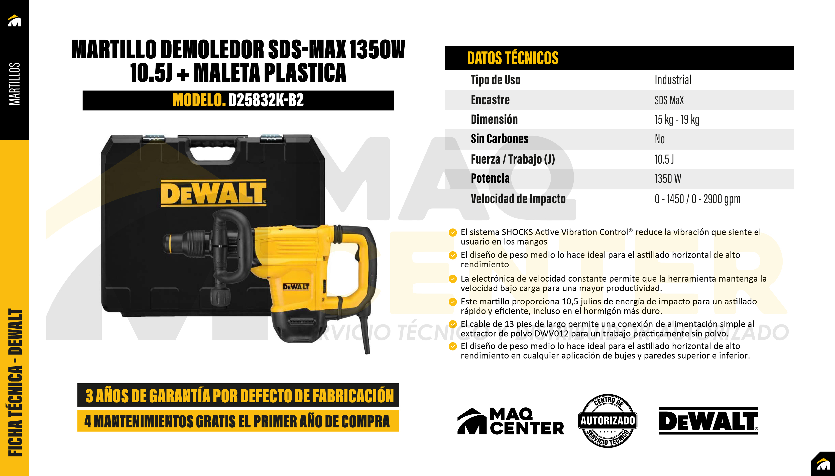 Incluye: (1) Martillo Demoledor D25832K-B2. (1) Mango de fianza de 360°. (1) Maleta Plástica.