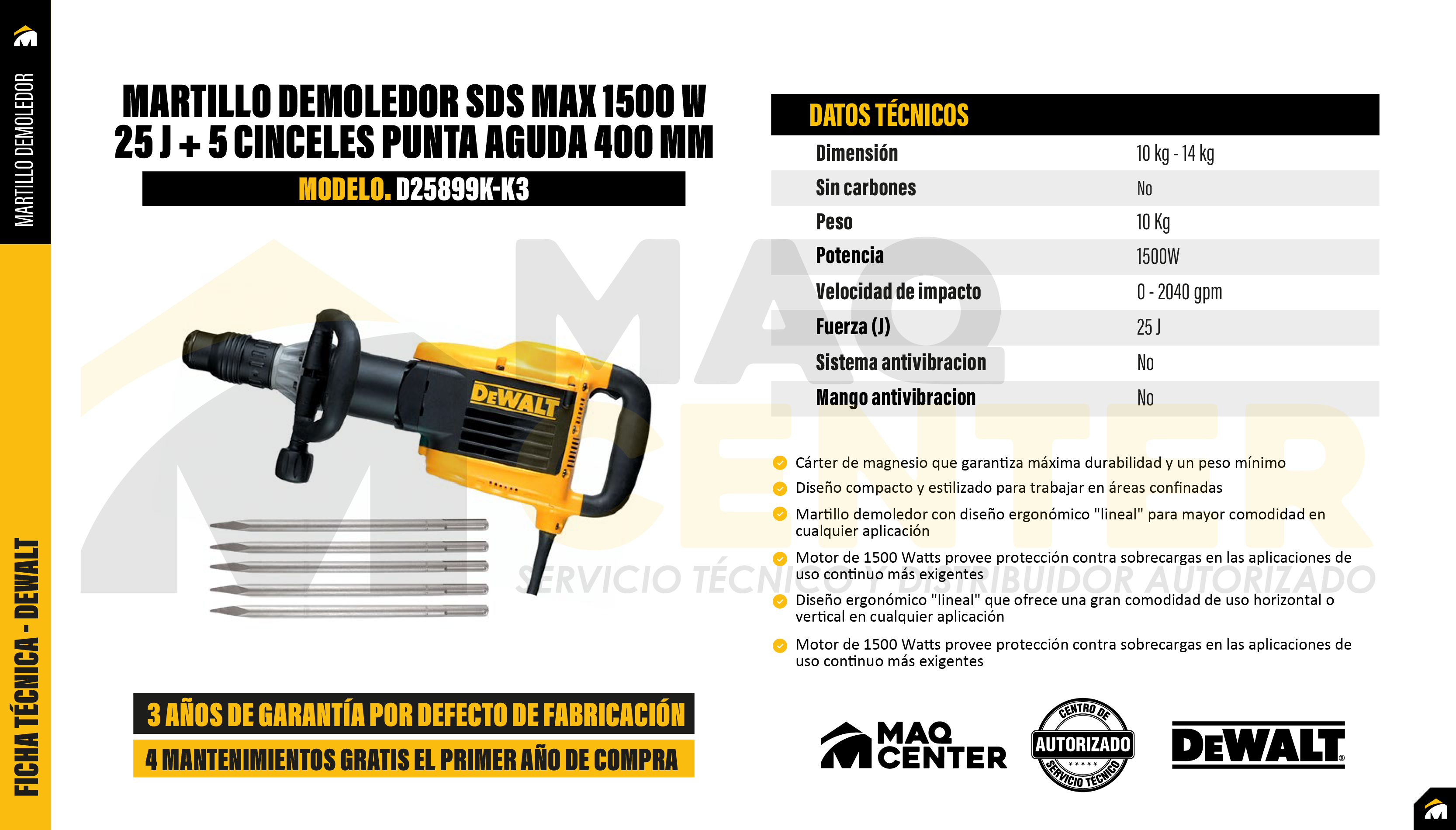 El Martillo Demoledor SDS Max D25899K de 10Kg proporciona un alto rendimiento sin sobrecalentamiento y una pieza batidora sin bombeo de aire para extender la vida útil de la herramienta y el sello al eliminar la entrada de polvo a la unidad. Un gran interruptor basculante facilita el encendido y apagado. El mango lateral permite que la operación sea fácil con 1 o 2 manos y el motor de 1500W provee protección contra sobrecargas en las aplicaciones de uso continuo más exigentes. Con diseño ergonómico (In-Line) ofrece gran comodidad de uso horizontal o vertical en cualquier aplicación. El gran interruptor basculante de encendido/apagado permite una fácil operación con un solo dedo. La rotación del cincel en un solo paso (12 posiciones) permite al usuario ajustar de forma rápida y precisa el cincel, no la herramienta. El mango de goma trasero grande permite una fácil operación con una o dos manos El mango lateral de posición variable permite una rotación de 360 grados y un ajuste de 150 grados para facilitar su uso. Diseño en línea para una fácil operación de la herramienta en aplicaciones horizontales o verticales. El portaherramientas SDS max con amortiguadores de goma absorbe energía y proporciona una vida útil más larga. Compatible con sistemas de extracción de polvo de cincelado.