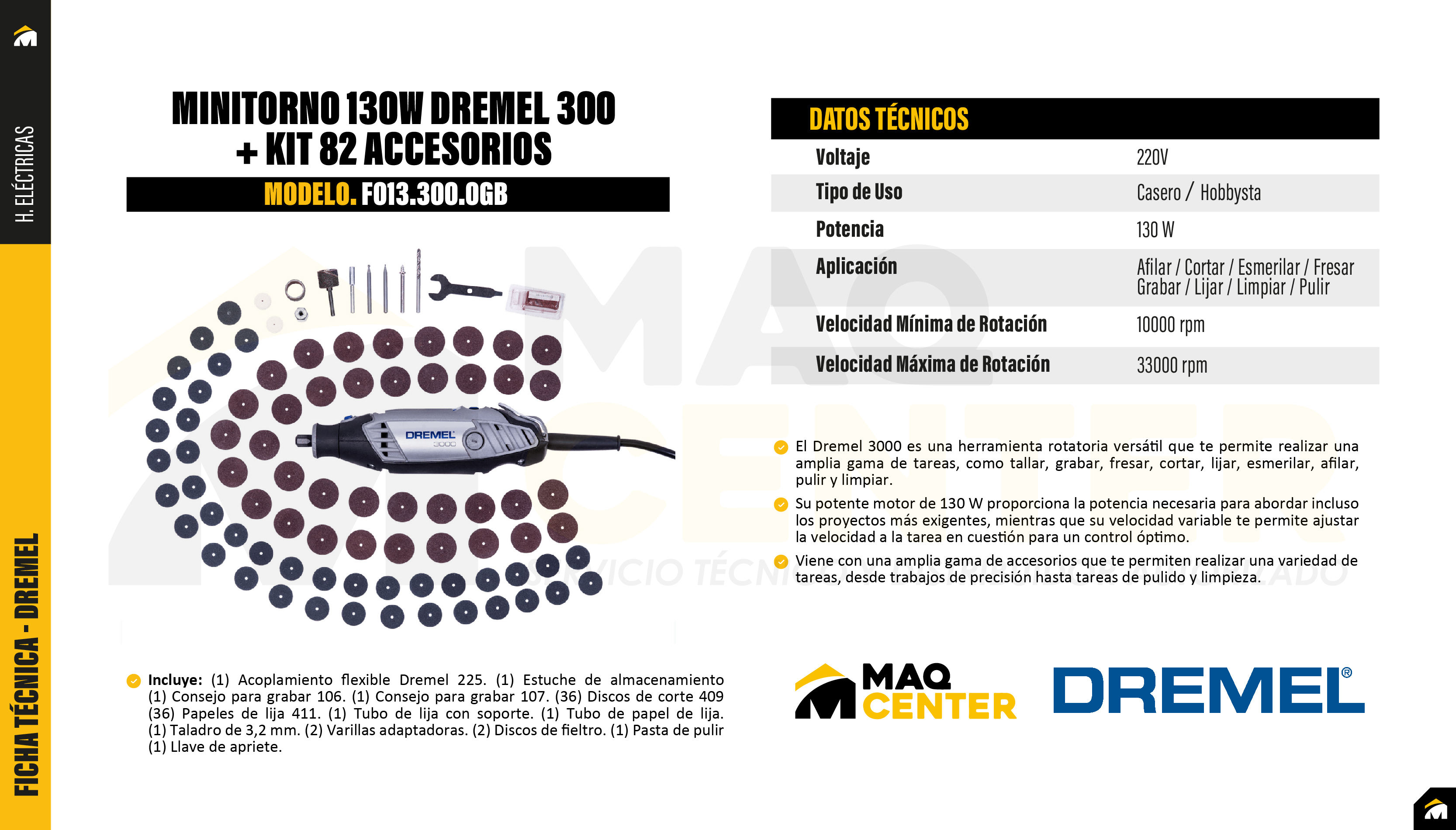 Cuenta con un motor de 130 W que garantiza potencia y precisión en diferentes aplicaciones. Incluye un kit completo con 82 accesorios para cortar, lijar, pulir, grabar y más. Su diseño ergonómico facilita el manejo y brinda comodidad durante el uso. Dispone de control de velocidad variable para adaptarse a cada tarea.