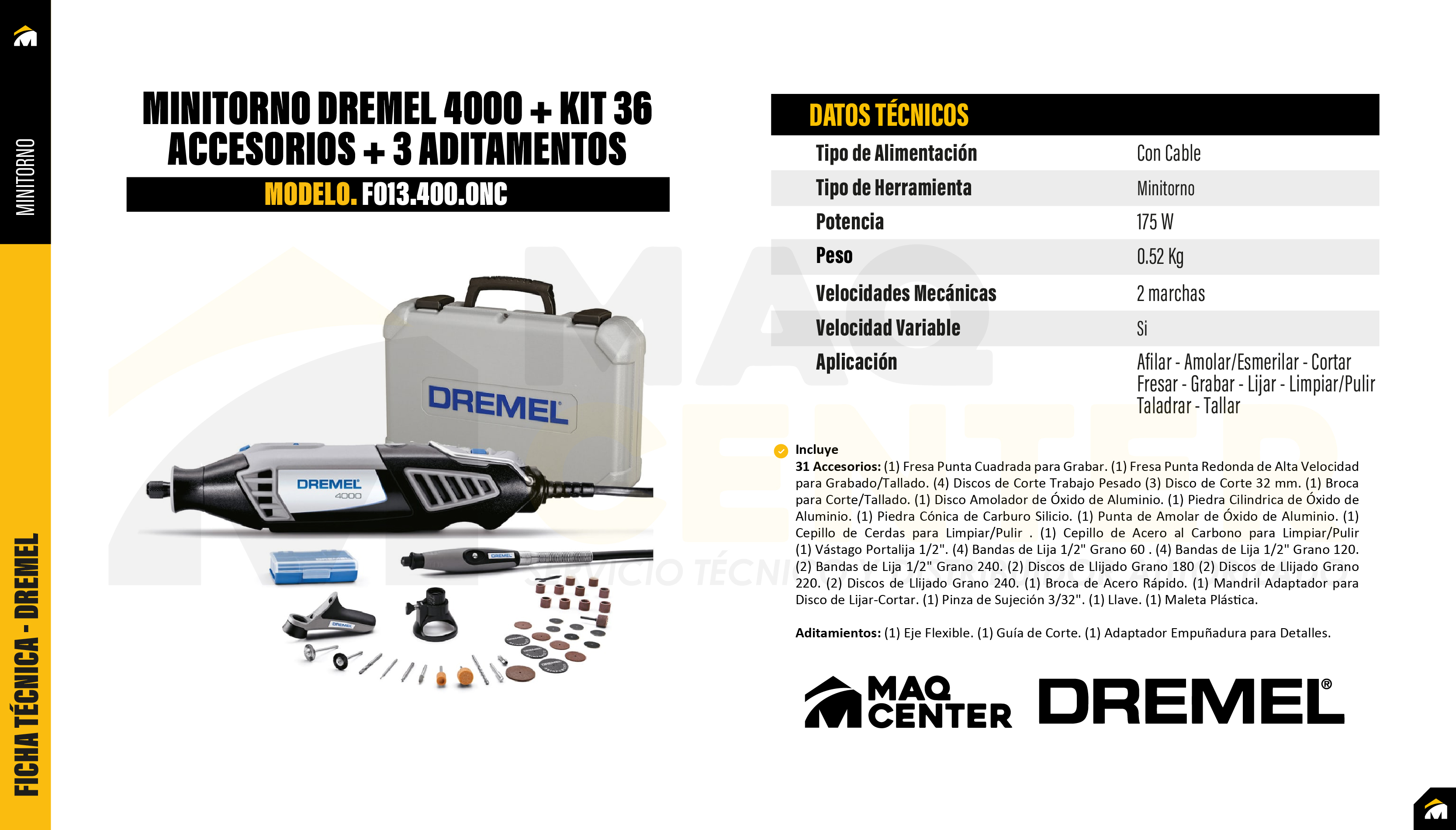 Aditamentos: (1) Eje Flexible (1) Guía de Corte (1) Adaptador Empuñadura para Detalles