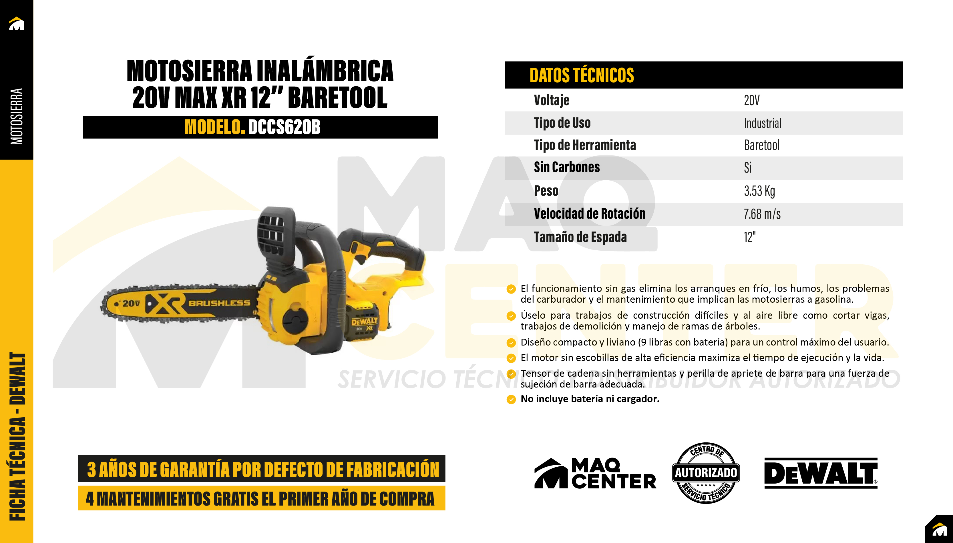 Motosierra inalámbrica 12'' 20v xr dewalt dccs620b