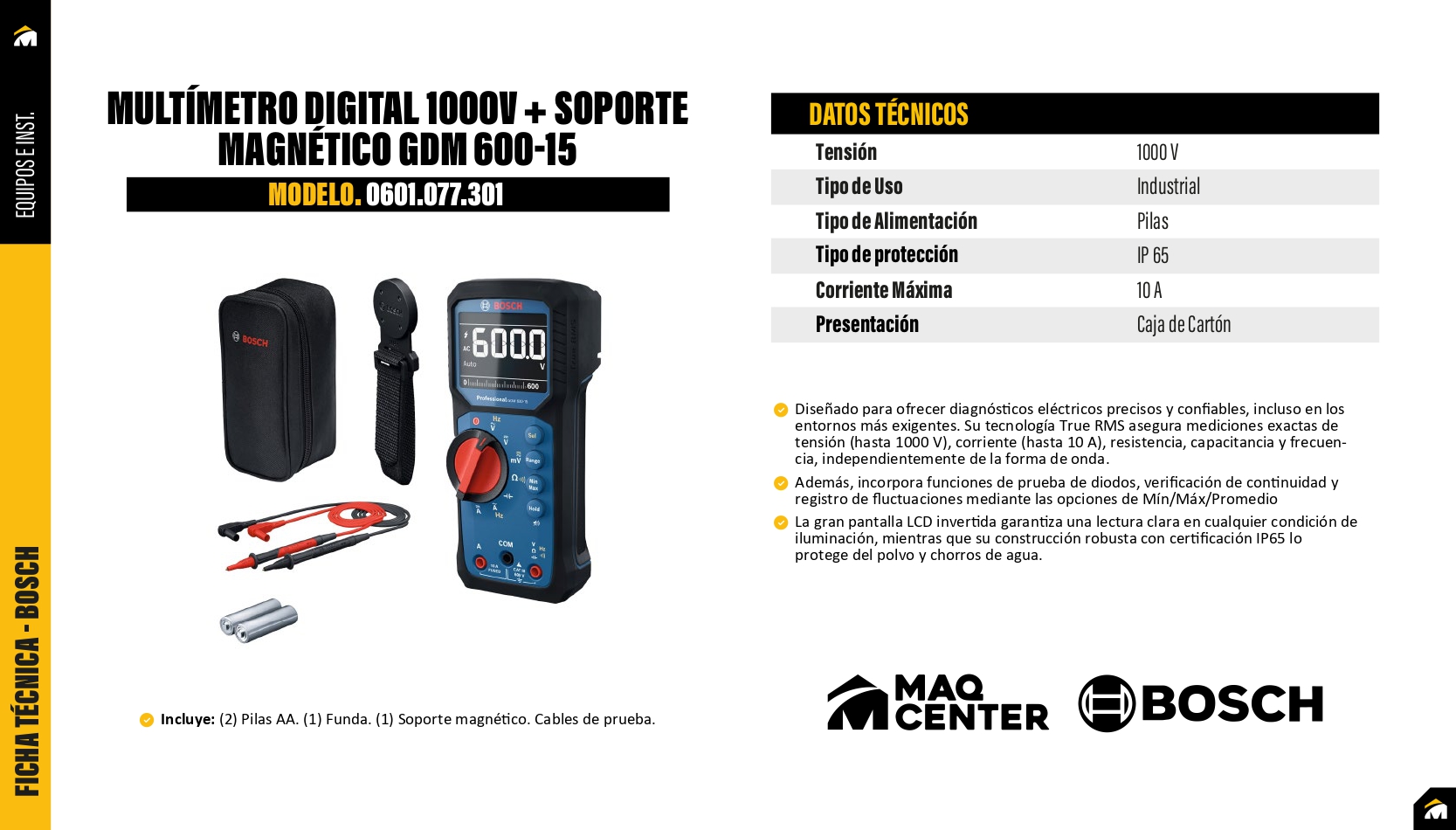 Incluye: (2) Pilas AA (1) Funda (1) Soporte magnético Cables de prueba