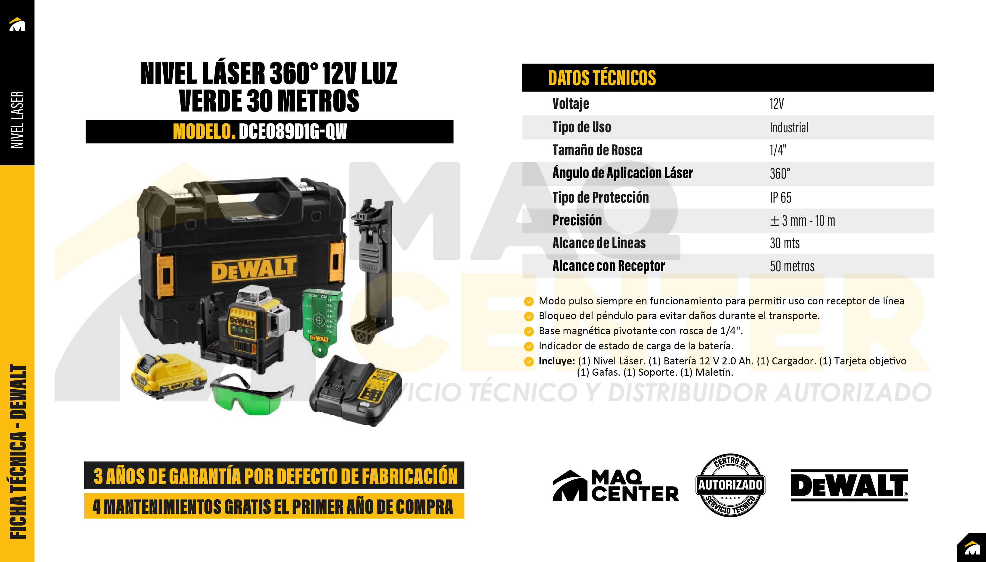Incluye: (1) Batería 12V 2.0Ah. (1) Cargador. (1) Soporte de montaje en pared. (1) Maletín. (1) Lentes.