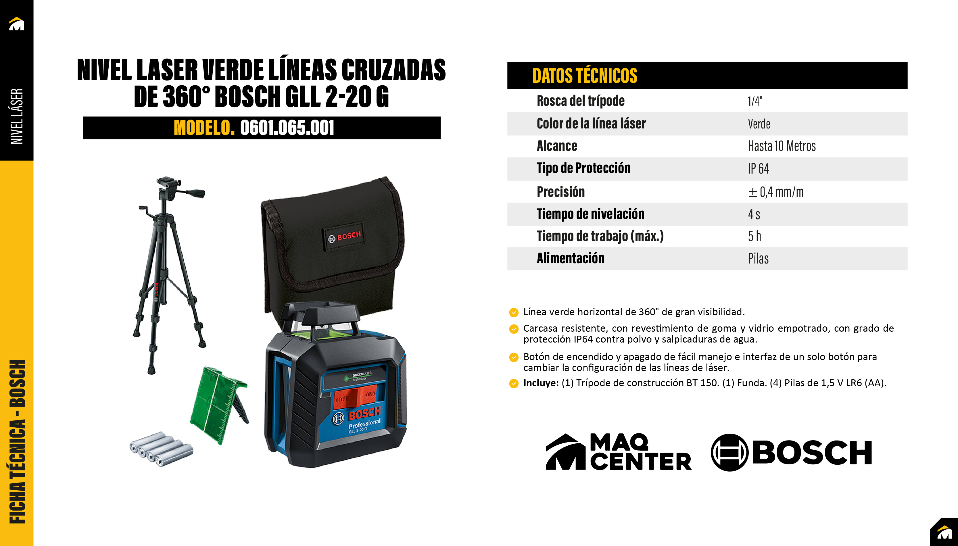 Incluye: (1) Trípode de construcción BT 150 Professional. (4) Pilas de 1.5V LR6 (AA). (1) Funda. (1) Placa reflectora de medida del láser.