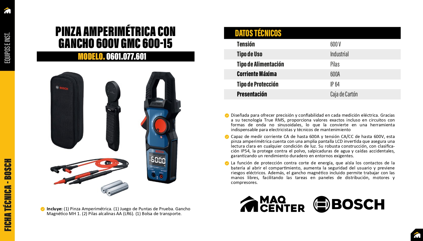 La pinza amperimétrica GMC 600-15 Bosch es una herramienta confiable para medir corriente de hasta 600V de manera segura y precisa. Su diseño con gancho permite acceder fácilmente a cables en espacios reducidos, lo que agiliza el trabajo en instalaciones eléctricas. Además, ofrece la posibilidad de medir corriente, voltaje y continuidad sin necesidad de interrumpir el circuito.