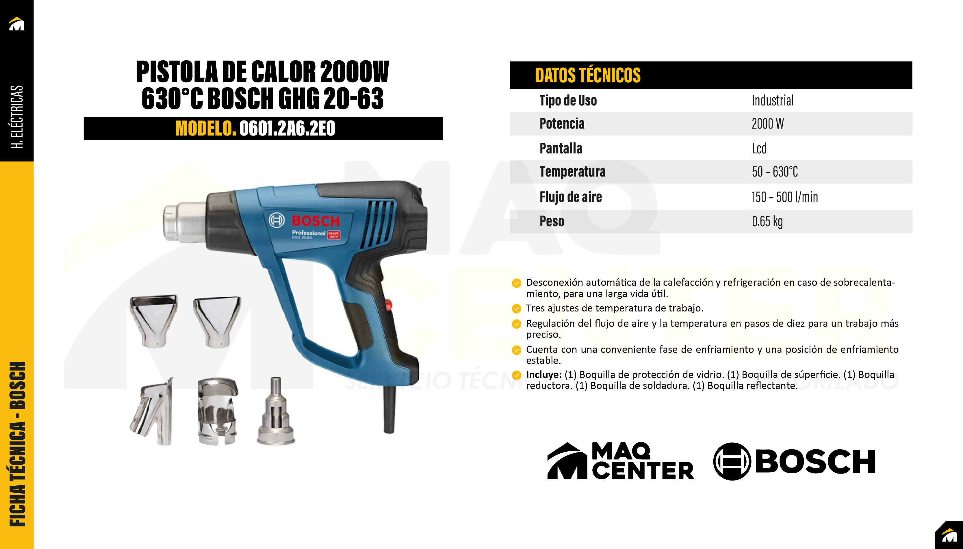 Incluye: (1) Boquilla reductora. (1) Boquilla con protección del vidrio. (1) Zapata de soldadura. (1) Boquilla para superficies. (1) Boquilla reflectora.