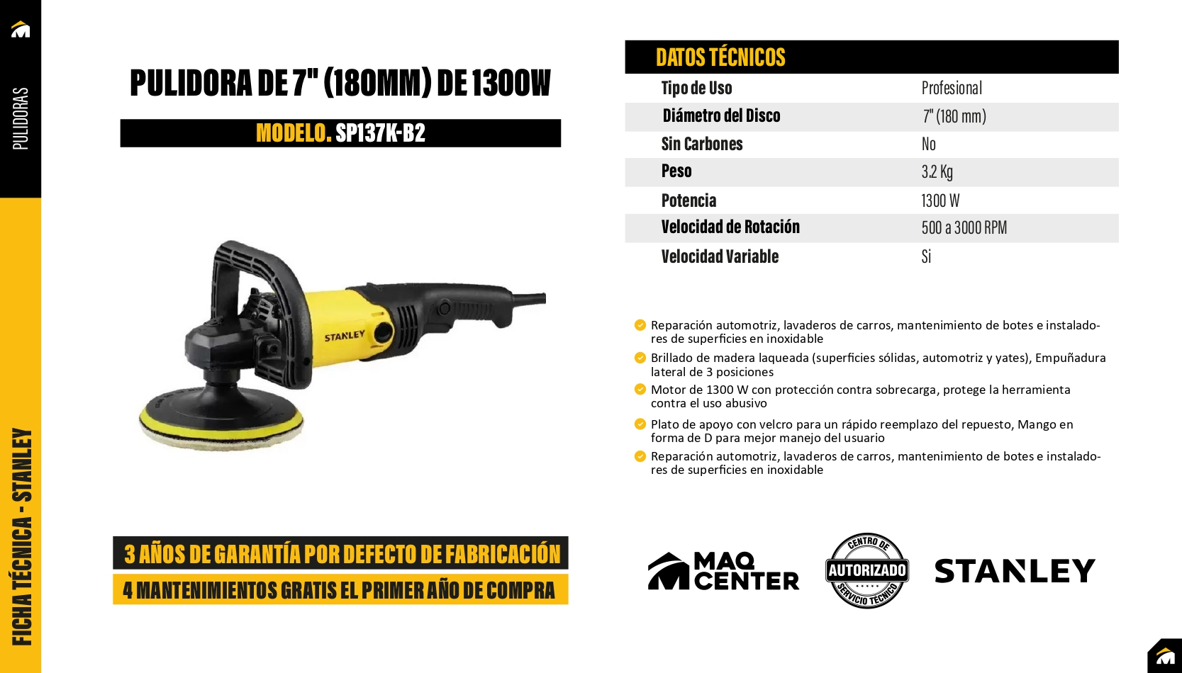 Pulidora de 7" 1300w c/caja plastica sp137k-b2 stanley