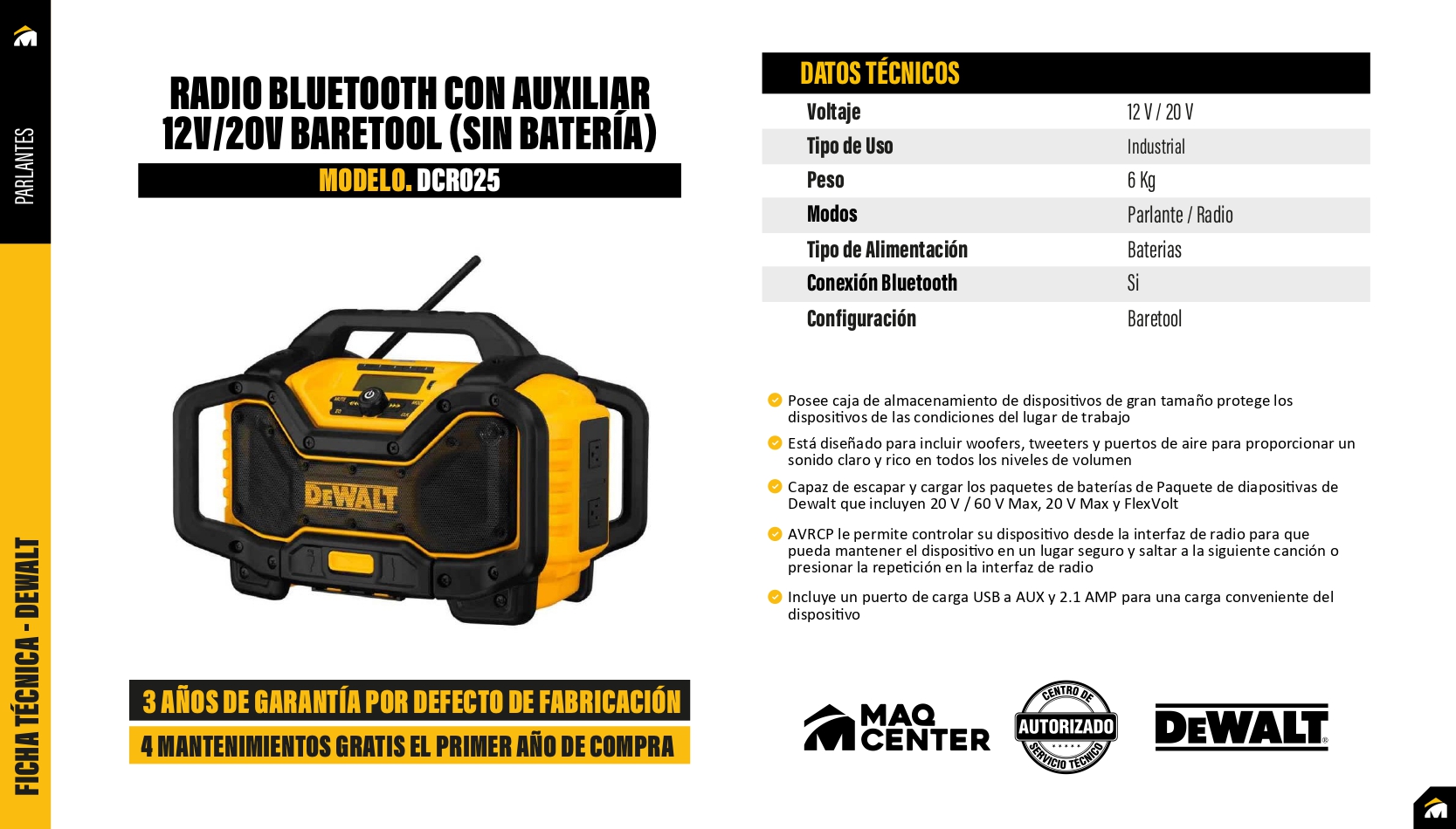 Radio bluetooth con auxiliar 12 v / 20 v baretool (sin batería) dewalt dcr025