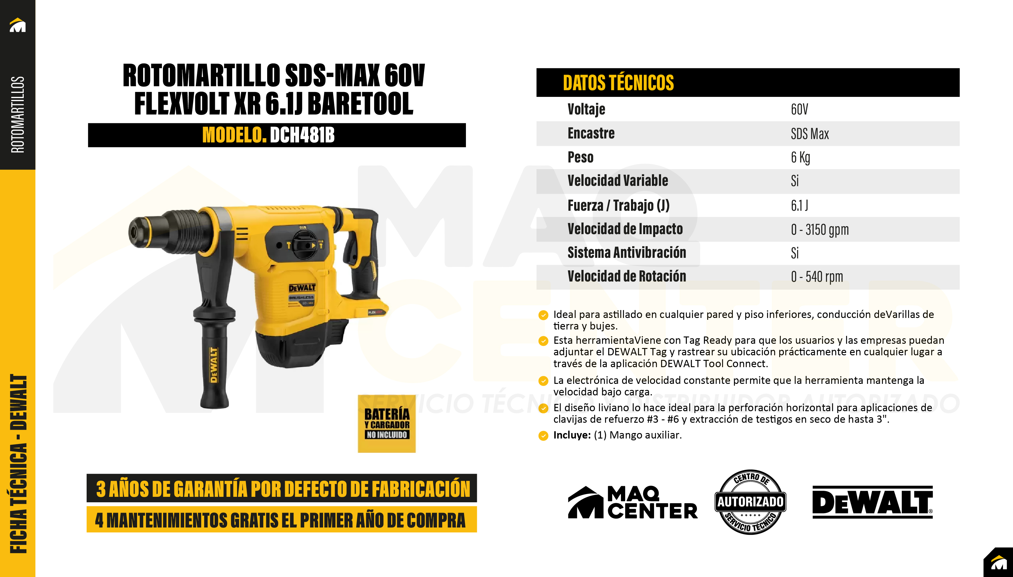 El martillo combinado SDS MAX sin escobillas de 60V MAX * 1-9 / 16 pulg. Es un martillo ligero de alto rendimiento que funciona con un motor sin escobillas y un mecanismo duradero de ingeniería alemana. Este martillo es parte de la línea de productos PERFORM & PROTECT ™, integrado con el Sistema Anti-Rotación E-CLUTCH® y el Sistema SHOCKS Active Vibration Control®. E-CLUTCH® apaga la herramienta en situaciones de atascamiento. SHOCKS ™ reduce la vibración que siente el usuario en los mangos, en comparación con los martillos perforadores sin esta función. Esta herramienta viene con Tag Ready ™ para que los usuarios y las empresas puedan adjuntar el DEWALT Tag ™ y rastrear su ubicación prácticamente en cualquier lugar a través de la aplicación DEWALT Tool Connect ™. La electrónica de velocidad constante permite que la herramienta mantenga la velocidad bajo carga. El diseño liviano lo hace ideal para la perforación horizontal para aplicaciones de clavijas de refuerzo # 3 - # 6 y extracción de testigos en seco de hasta 3 pulg.