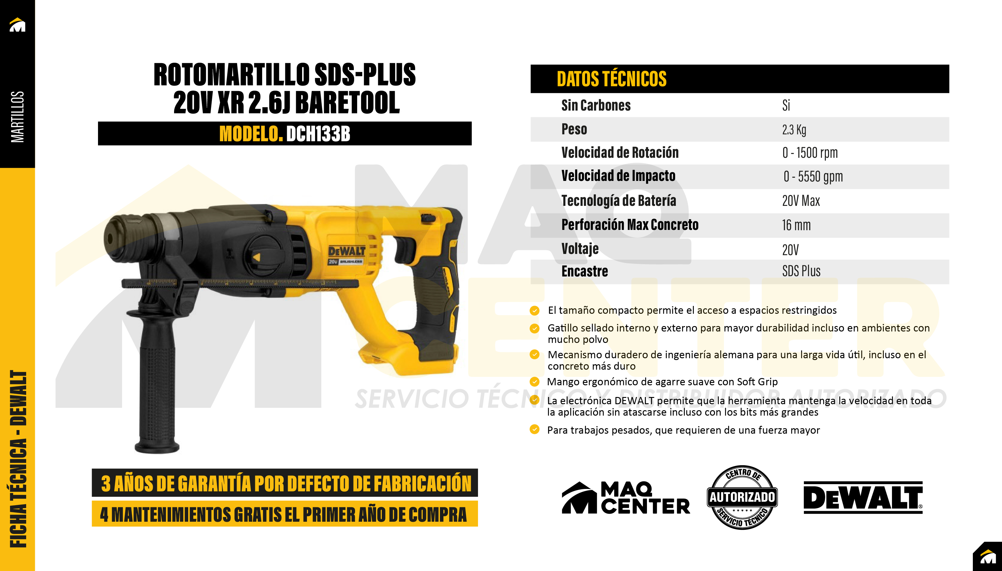 Equipado con un sistema SDS Plus y energía de impacto de 2.6 J, este rotomartillo inalámbrico de 20V MAX XR está diseñado para ofrecer un rendimiento superior en tareas de perforación y cincelado en concreto, ladrillo y mampostería. Su mecanismo de impacto de alta eficiencia permite avanzar rápidamente en superficies duras, siendo ideal para instalaciones, fijaciones y trabajos estructurales. Además, su diseño compacto y bien balanceado lo hace fácil de maniobrar incluso en espacios reducidos.