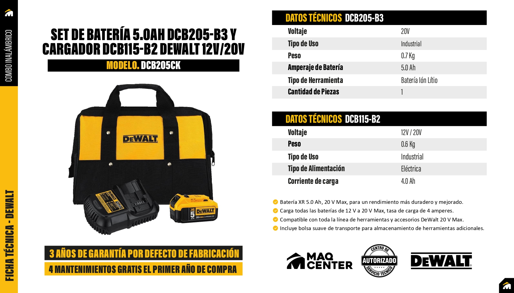 Batería XR 5.0 Ah, 20 V Max, para un rendimiento más duradero y mejorado. Proporciona información inmediata sobre el estado de carga con el sistema de indicador de combustible de 3 LED. Carga todas las baterías de 12 V a 20 V Max, tasa de carga de 4 amperes. Compatible con toda la línea de herramientas y accesorios DeWalt 20 V Max. Incluye bolsa suave de transporte para almacenamiento de herramientas adicionales.