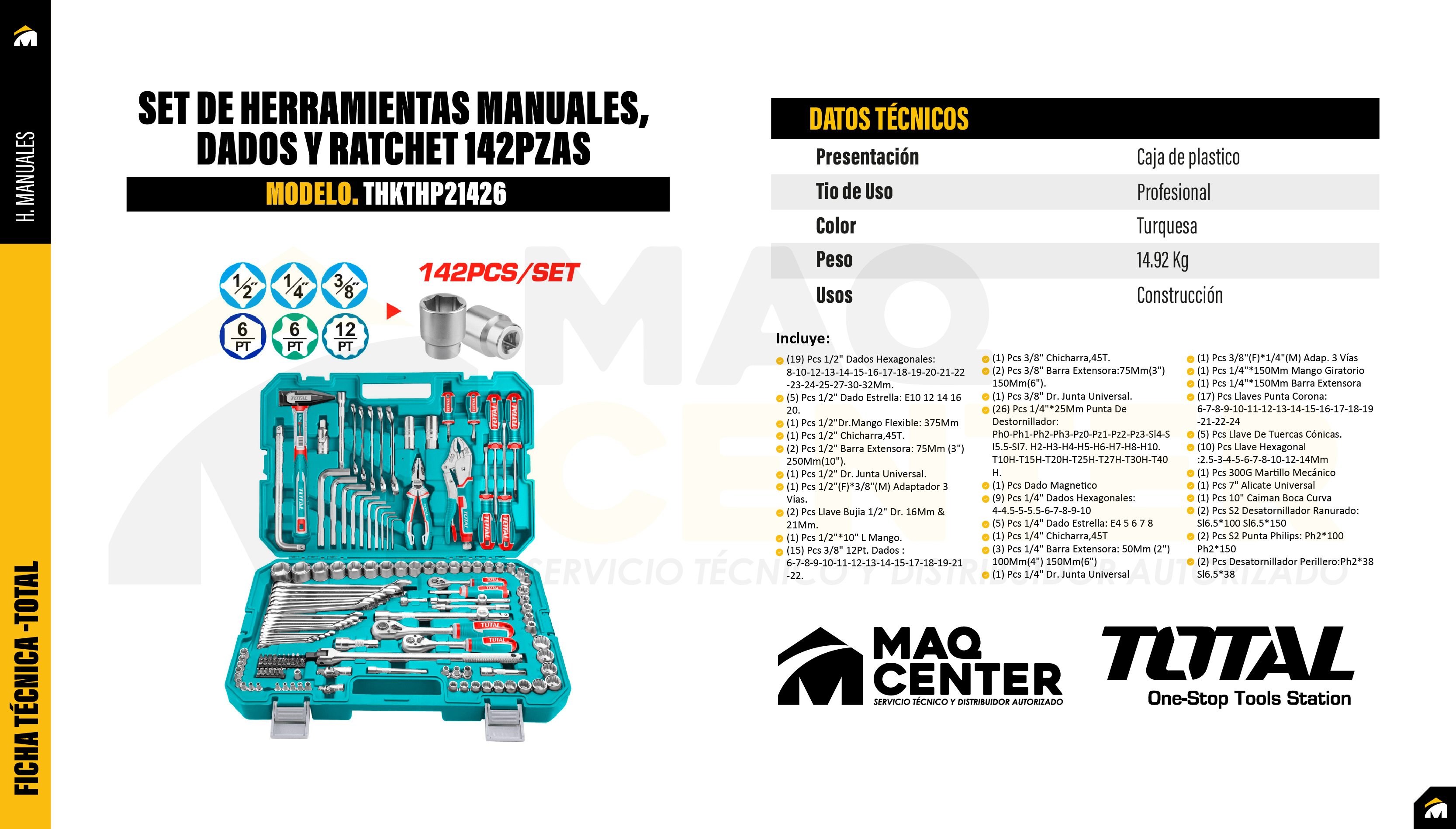 Incluye: Pieza DR 1/2" 19 dados hexagonales de 1/2": 8-10-12-13-14-15-16-17-18-19-20-21-22-23-24-25-27-30-32 mm 5 dados estrella de 1/2": E10, 12, 14, 16, 20 1 mango flexible DR (1/2"), 375 mm 1 llave ratchet 1/2", 45T 2 barras de extensión: 1/2": 75 mm (3") y 250 mm (10") 1 junta universal DR 1/2" 1 adaptador de tres vías 1/2" (F)x3/8" (M) 2 dados de 1/2" DR 16 mm y 21 mm 1 mango L de 1/2" x 10" Pieza DR 3/8" 15 dados de 3/8" y 12 puntas: 6-7-8-9-10-11-12-13-14-15-17-18-19-21-22 1 llave ratchet de 3/8" 45T 2 barras de extensión de 3/8": 75 mm (3") y 150 mm (6") 1 junta universal DR 3/8" Pieza DR 1/4" 26 puntas de destornillador de 1/4" x 25mm: PH0-PH1-PH1-PH2-PH2-PH3-PZ0-PZ1-PZ2-PZ3-SL4-SL5-SL6-SL7-H2-H3-H4-H5-H6-T10H-T15H-T20H-T25H-T27H-T30H- T40H 1 soporte para brocas. 9 dados hexagonales de 1/4": 4-4.5-5-5.5-6-7-8-9-10 5 dados estrella de 1/4": E4, 5, 6, 7, 8 1 llave ratchet de 1/4", 45T 3 barras de extensión de 1/4": 50mm (2"), 100mm (4") y 150mm (6") 1 junta universal DR 1/4" 1 adaptador de tres vías 3/8" (F)x1/4" (M) 1 mango giratorio 1/4" x 150mm 1 barra de extensión flexible 1/4" x 150mm Otras herramientas 17 llaves combinadas: 6-7-8-9-10-11-12-13-14-15-16-17-18-19-21-22-24 5 llaves para tuercas abocardadas: 8*10-10*12-11*13-12*14-17*19 10 piezas de llave hexagonal: 2,5-3-4-5-6-7-8-10-12-14 mm 1 martillo maquinista 300 g. 1 alicate combinado 7" 1 llave de presión curvo 10" 2 destornilladores ranurados: SL6.5*100 SL6.5*150 2 destornilladores Phillips: PH2*100 PH2*150 2 destornilladores Stubby: PH2*38 SL6.5*38 Presentación Maletín de plástico