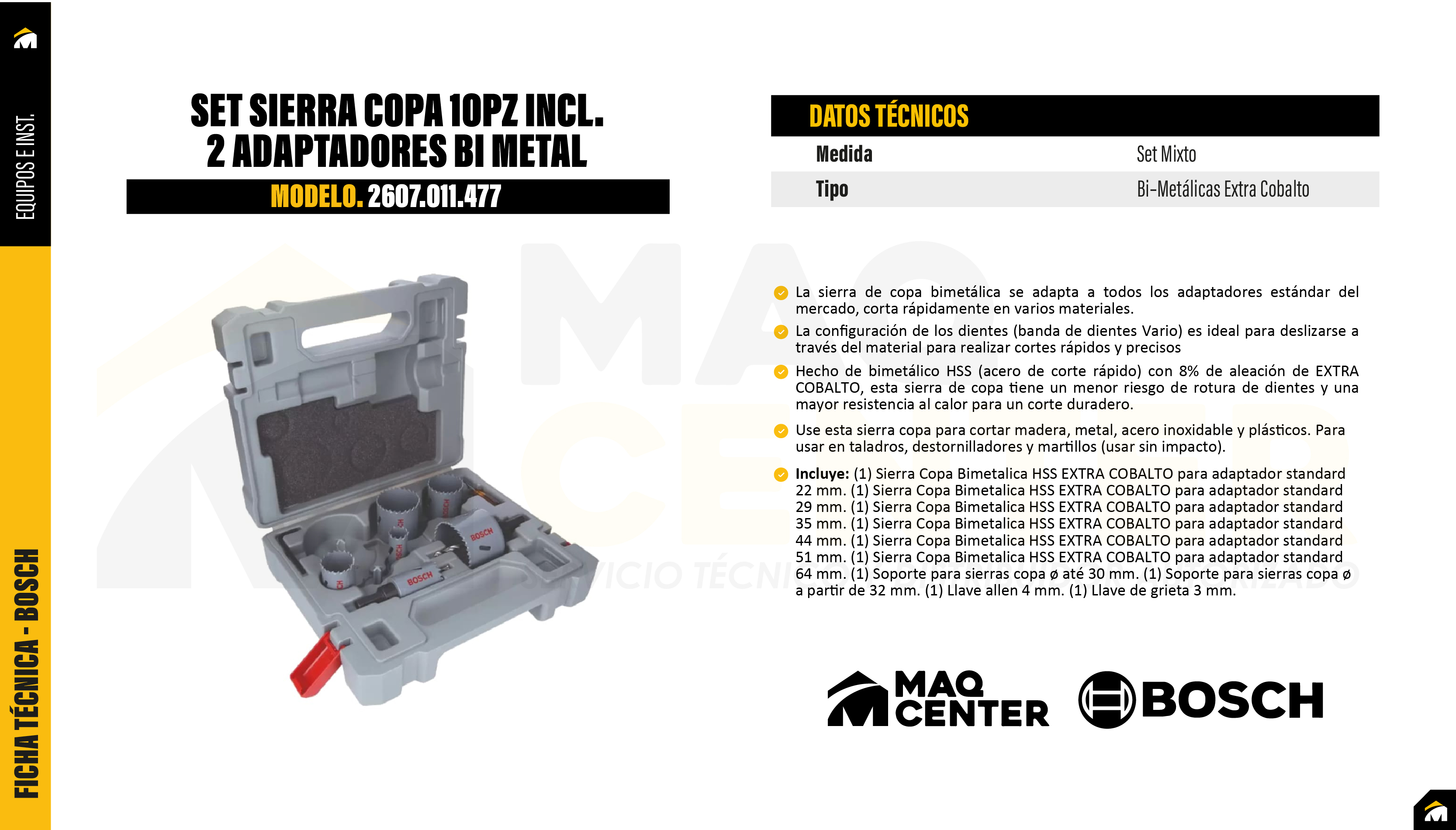 Incluye: (1) Sierra Copa Bimetalica HSS EXTRA COBALTO para adaptador standard 22 mm (1) Sierra Copa Bimetalica HSS EXTRA COBALTO para adaptador standard 29 mm (1) Sierra Copa Bimetalica HSS EXTRA COBALTO para adaptador standard 35 mm (1) Sierra Copa Bimetalica HSS EXTRA COBALTO para adaptador standard 44 mm (1) Sierra Copa Bimetalica HSS EXTRA COBALTO para adaptador standard 51 mm (1) Sierra Copa Bimetalica HSS EXTRA COBALTO para adaptador standard 64 mm (1) Soporte para sierras copa ø até 30 mm (1) Soporte para sierras copa ø a partir de 32 mm (1) Llave allen 4 mm (1) Llave de grieta 3 mm
