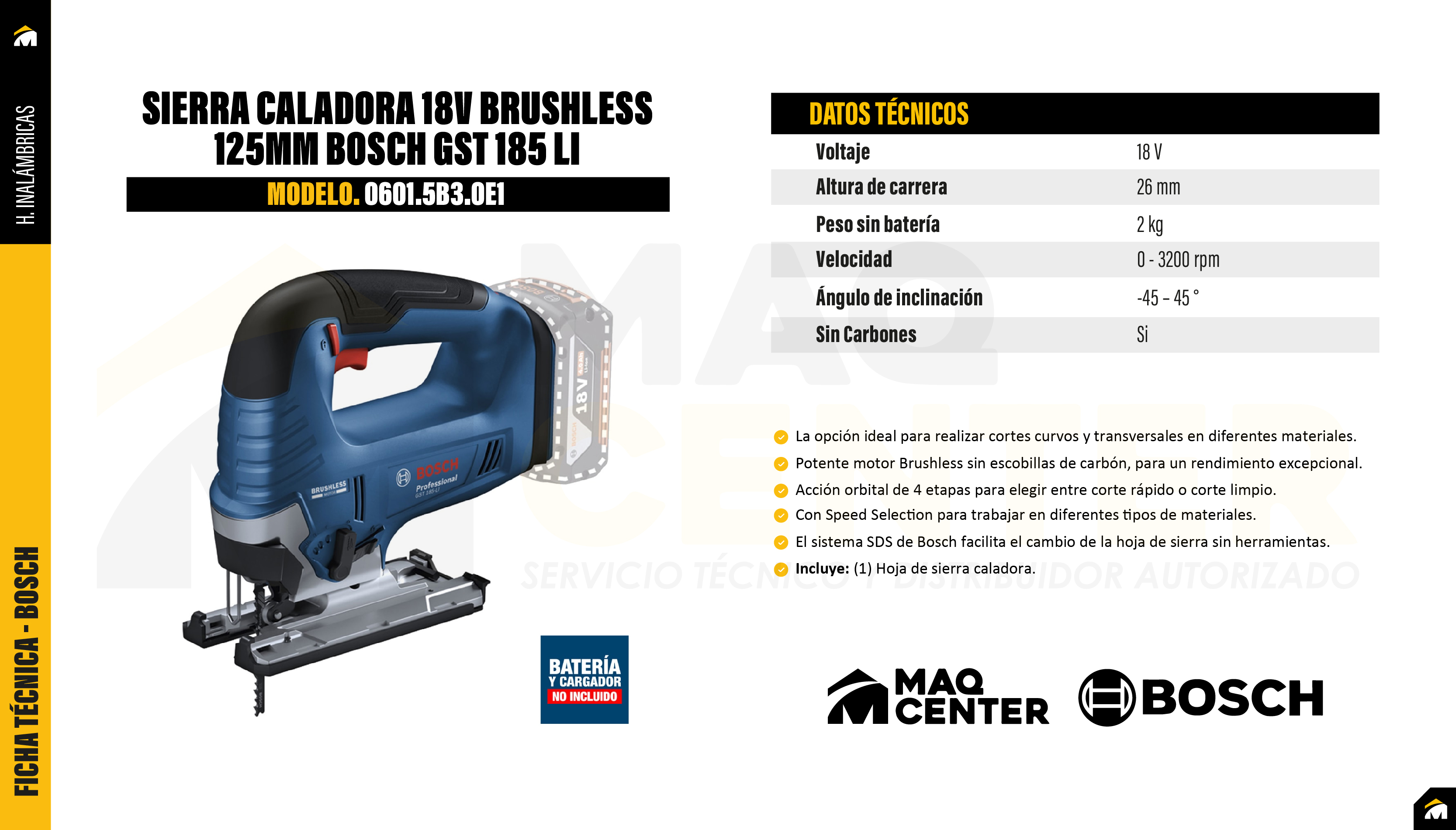 Esta sierra caladora inalámbrica GST 185-LI es ideal para realizar cortes curvos y transversales en madera maciza, tablero de aglomerado y compuestos de madera, así como en materiales más gruesos o duros. La función Speed Selection permite trabajar en diferentes tipos de materiales. Con su potente motor Brushless sin escobillas de carbón y su sistema mecánico de eficacia comprobada, reemplaza fácilmente a las sierras caladoras con cable, al ofrecer un rendimiento equivalente. Su acción orbital de 4 etapas permite elegir entre corte rápido o corte limpio. Incorpora una placa base ajustable en 45° para cortes en bisel. El sistema SDS de Bosch facilita el cambio de la hoja de sierra sin herramientas.